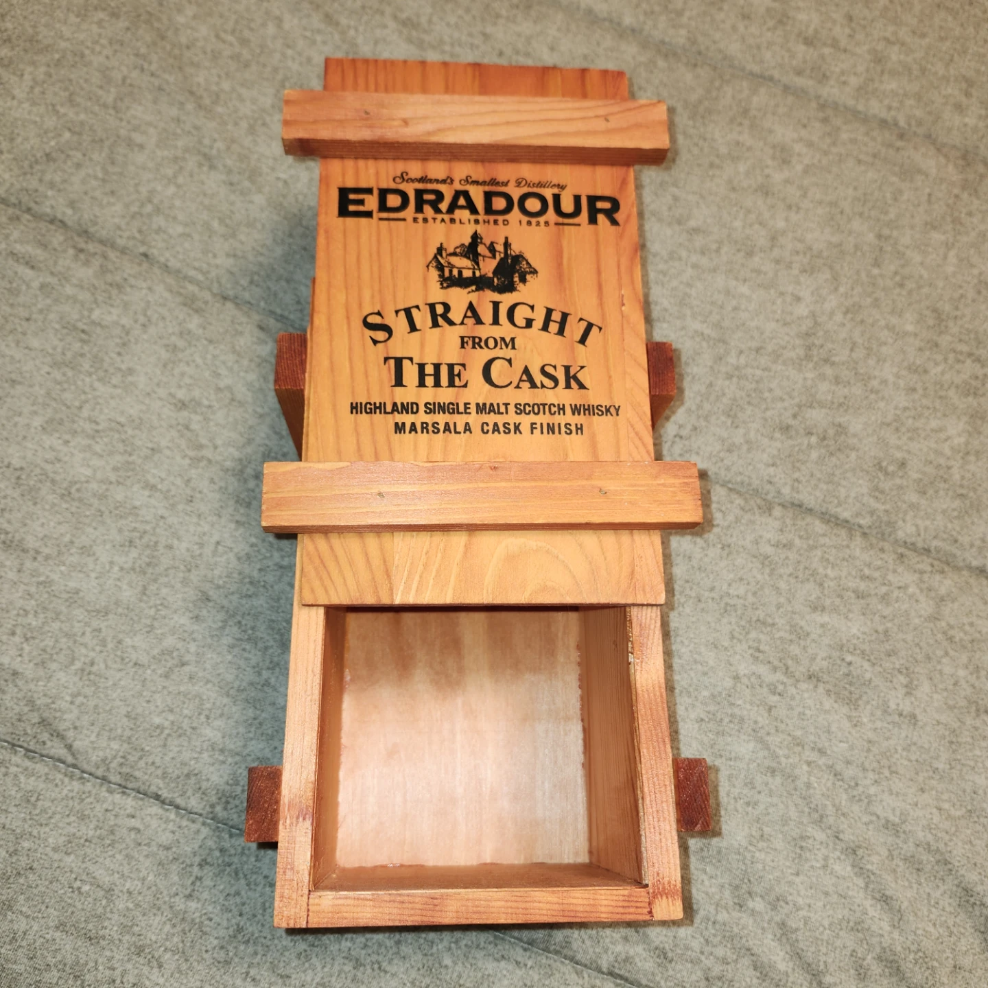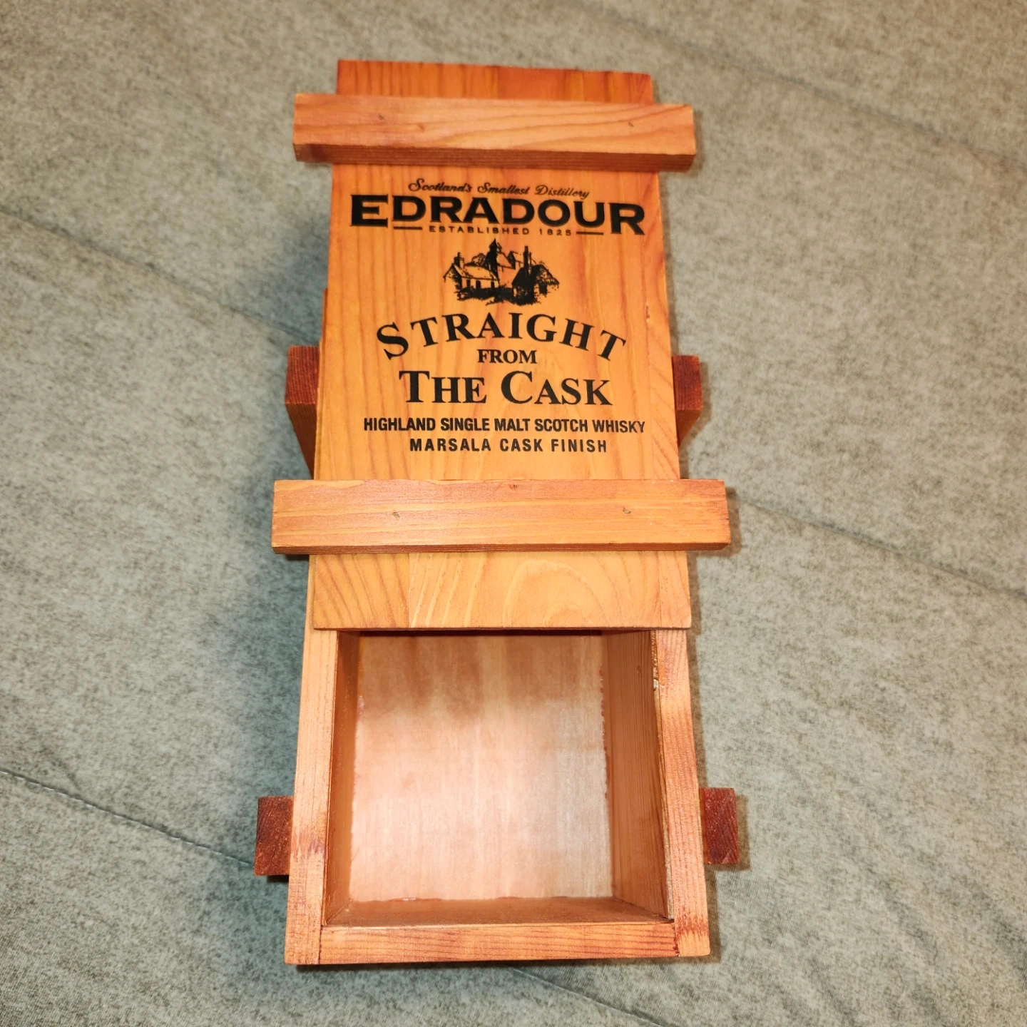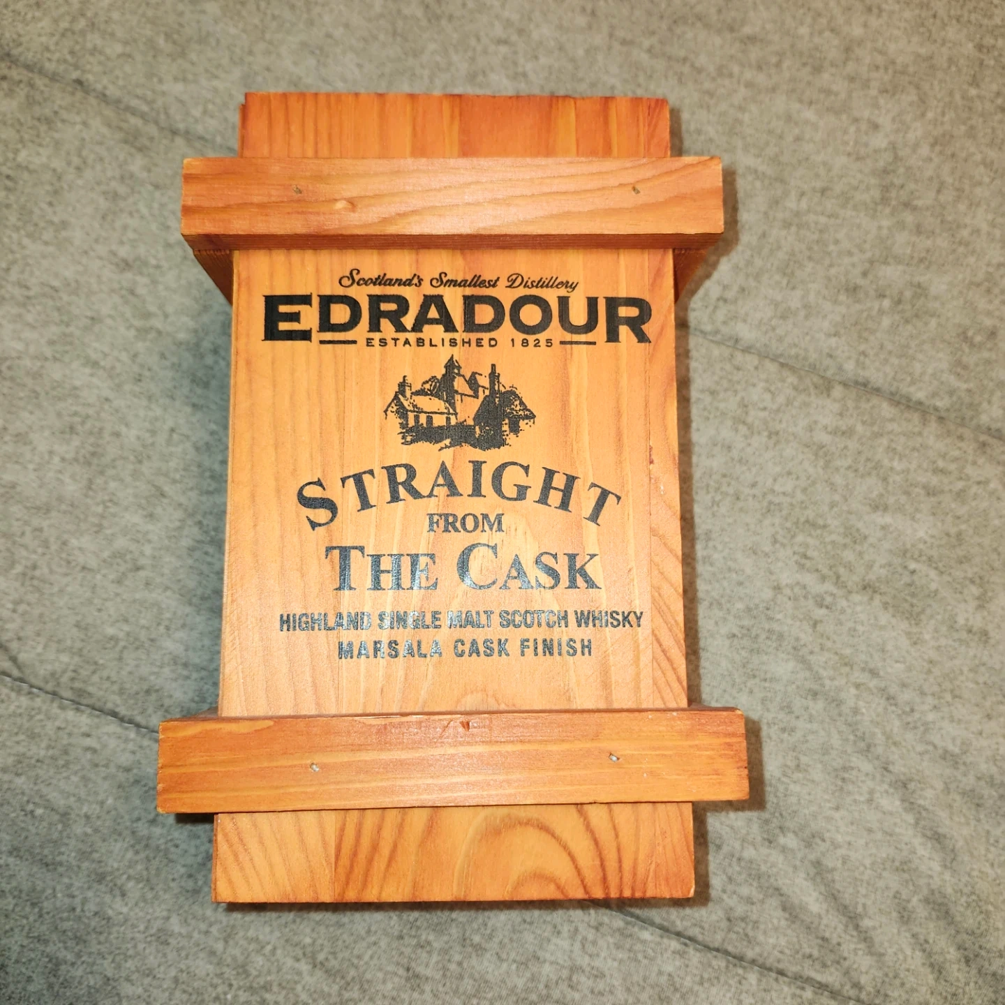 This is a wooden box from Edradour Distillery, featuring 'Straight from the Cask' and 'Marsala Cask Finish' details. It's a collectible item from Scotland's smallest distillery, established in 1825. A great keepsake for whisky enthusiasts!
