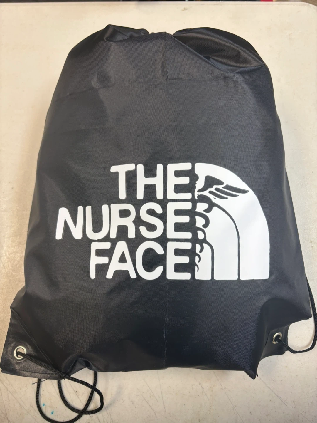 This is a black drawstring bag with 'The Nurse Face' printed in white. It's made of nylon and features metal grommets at the base for durability. This bag's great for carrying essentials.