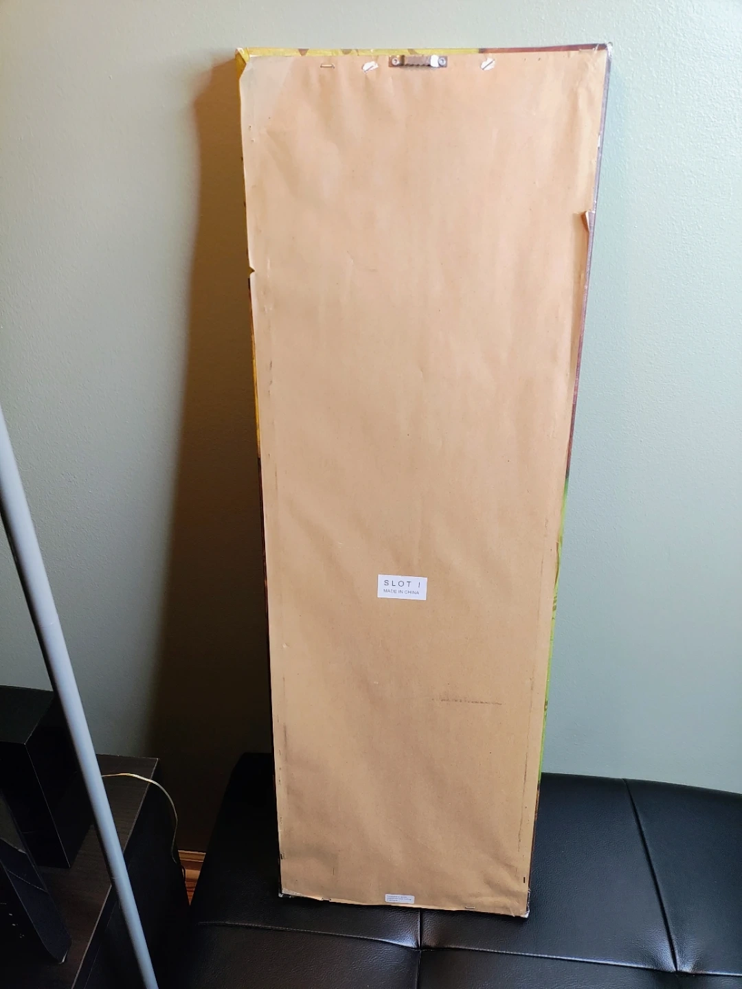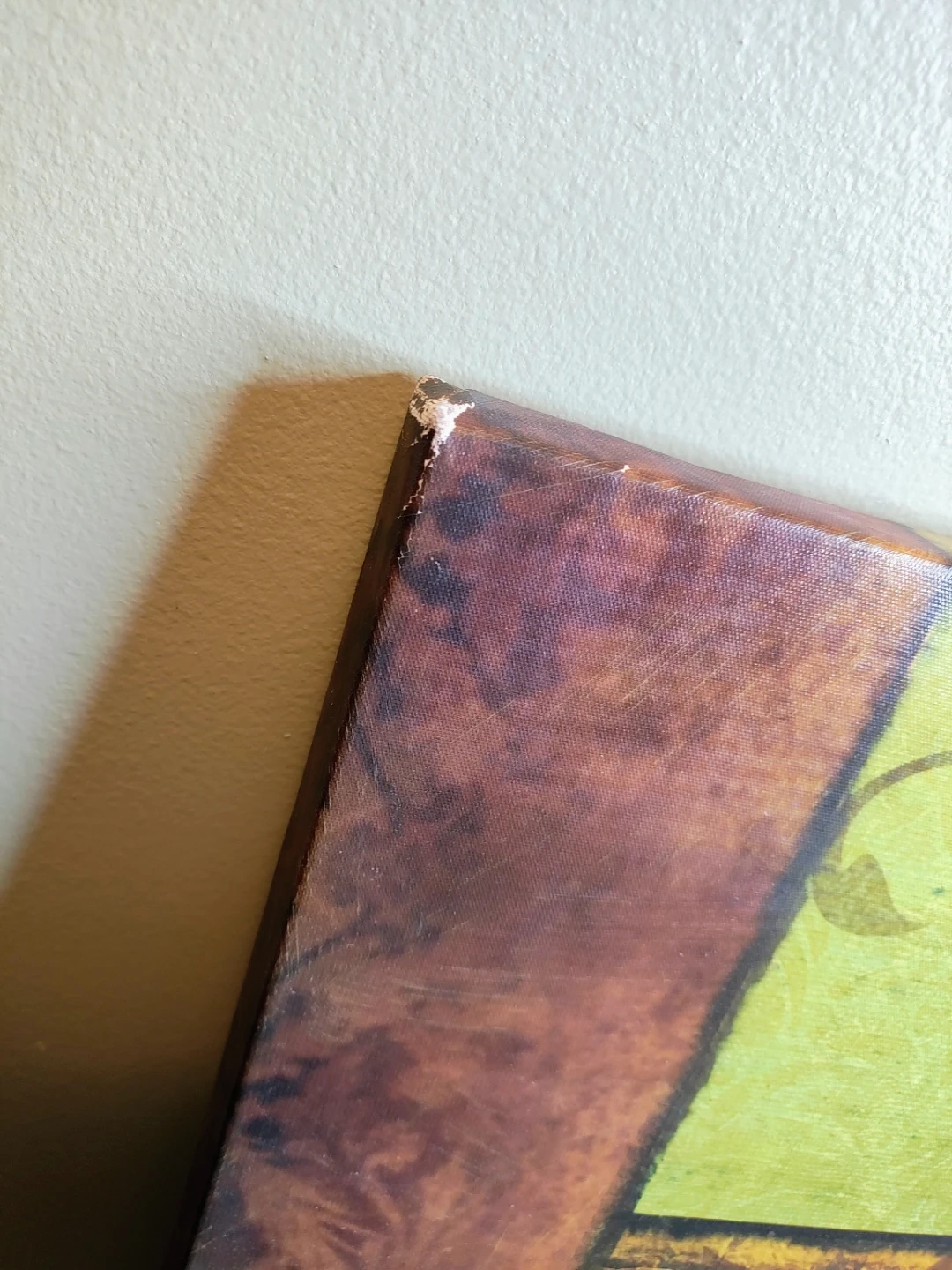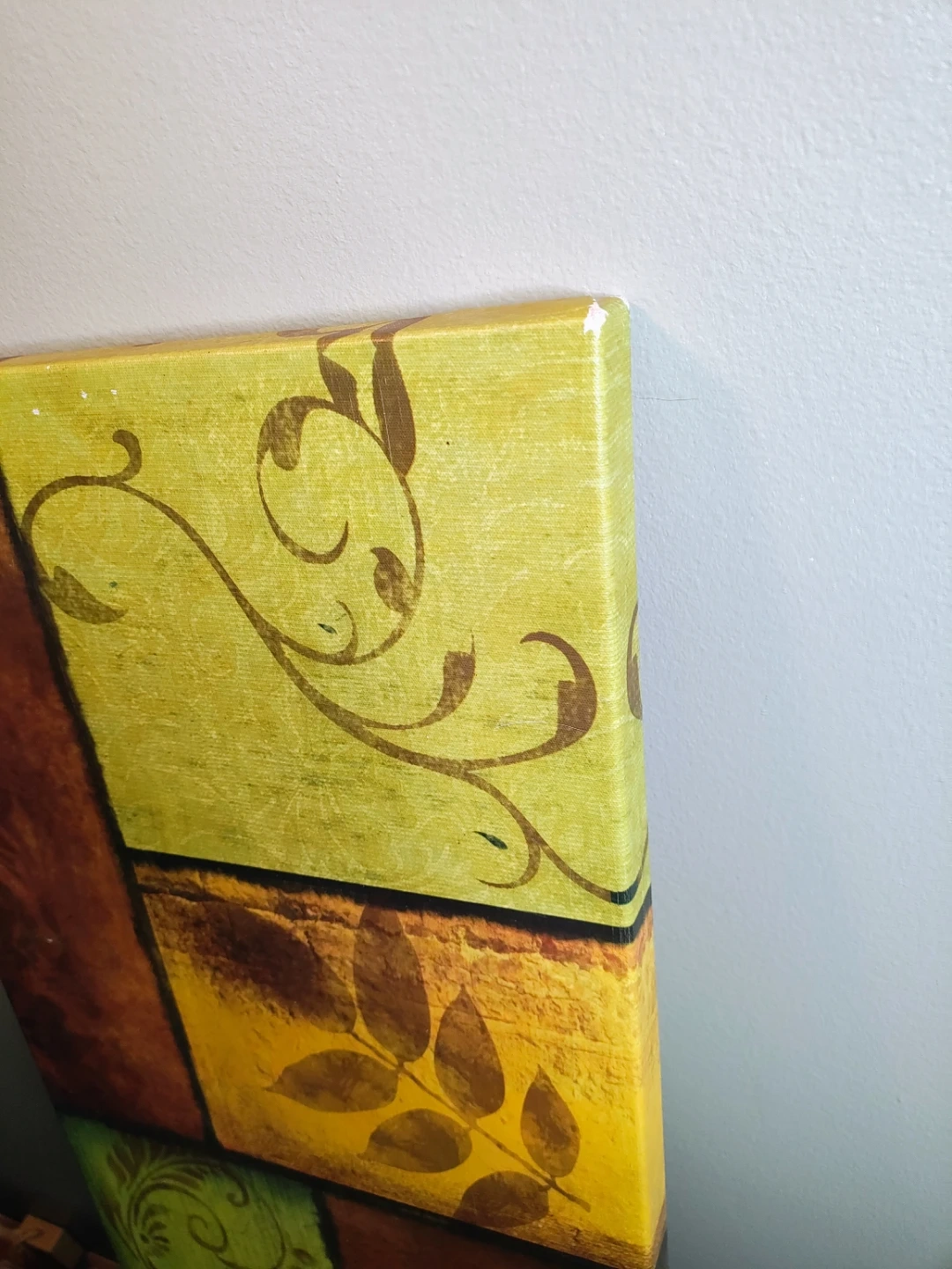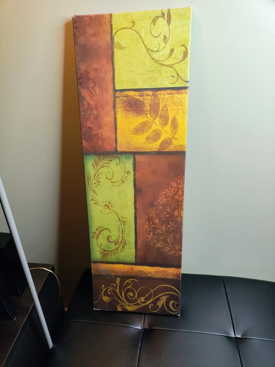 Selling this wall art canvas. It has a green, yellow, and brown color scheme with a floral design. There is some wear on the corners. 36" long 12" wide. Cash only pick up only