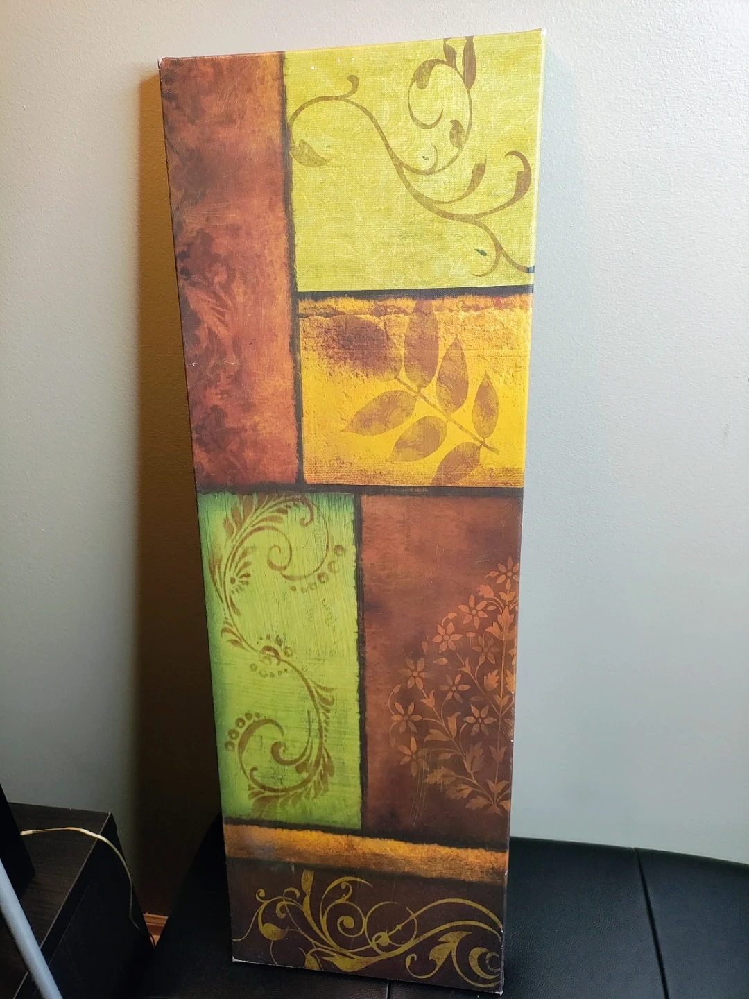 Selling this wall art canvas. It has a green, yellow, and brown color scheme with a floral design. There is some wear on the corners. 36" long 12" wide. Cash only pick up only