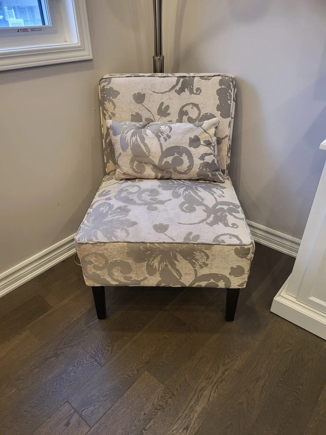 Stylish accent chair upholstered in a beige fabric with a grey floral pattern. It comes with a matching lumbar pillow for added comfort. The chair features dark wooden legs and a compact design.