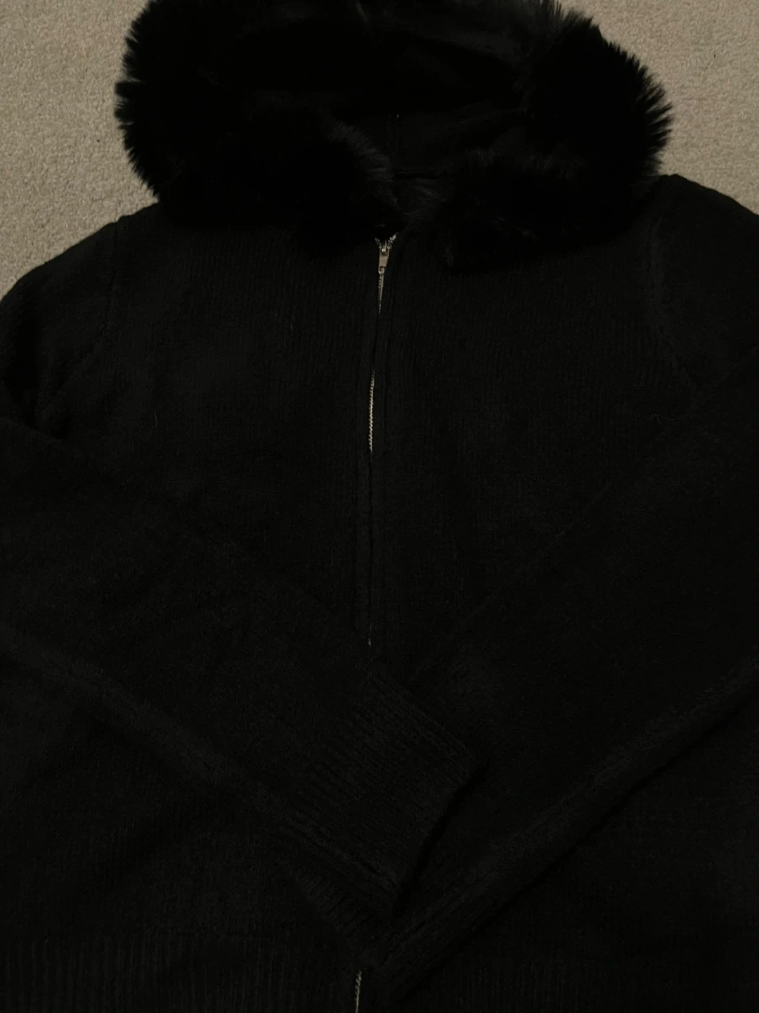 Cozy black zip-up cardigan with a comfortable hood trimmed in soft faux fur. It's made from a knit material, perfect for layering. The ribbed cuffs and hem add a nice finish.