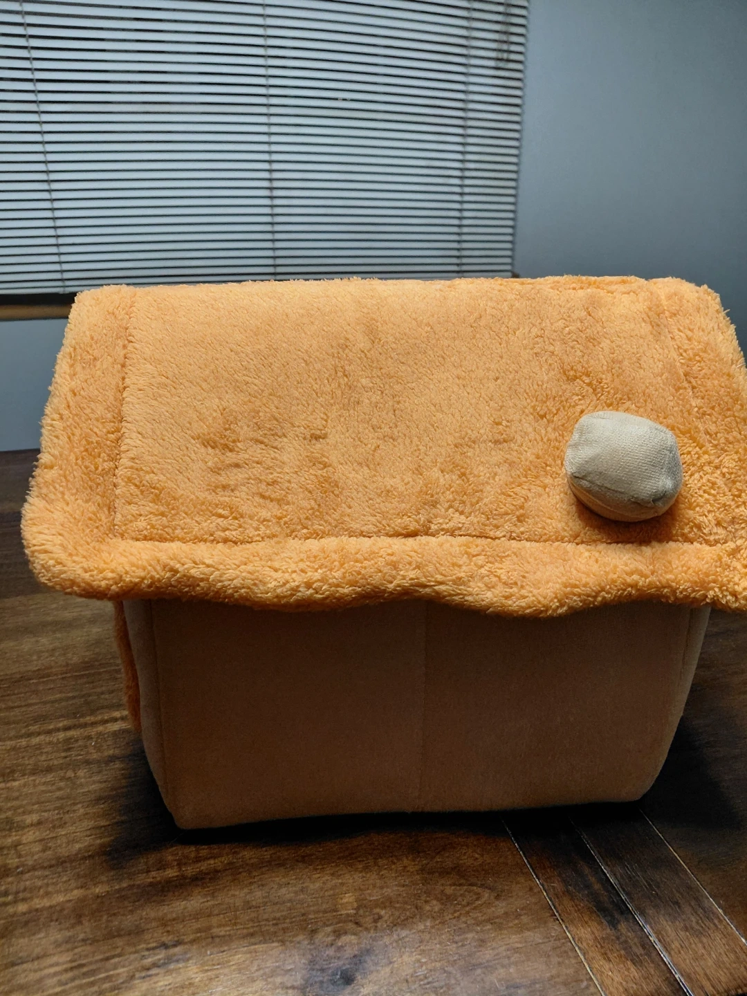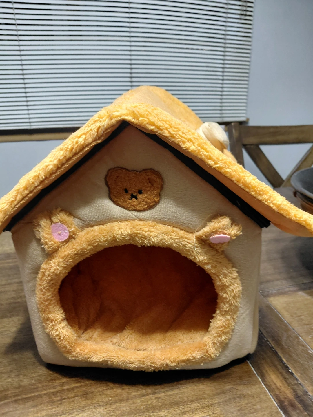 This adorable plush pet house bed offers a cozy spot for your furry friend. It's designed in a charming house shape with cute teddy bear and ear details. The soft, fluffy material makes it a comfy retreat for small pets.