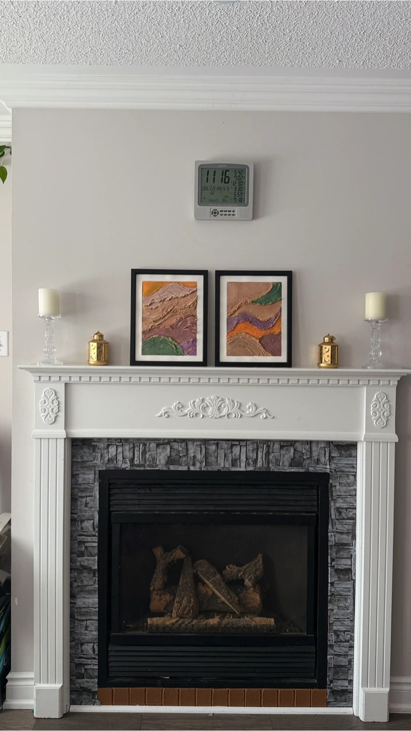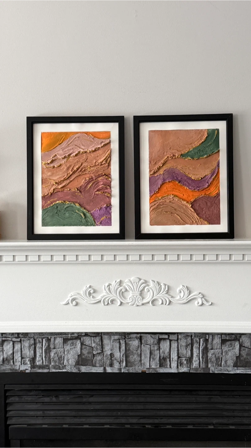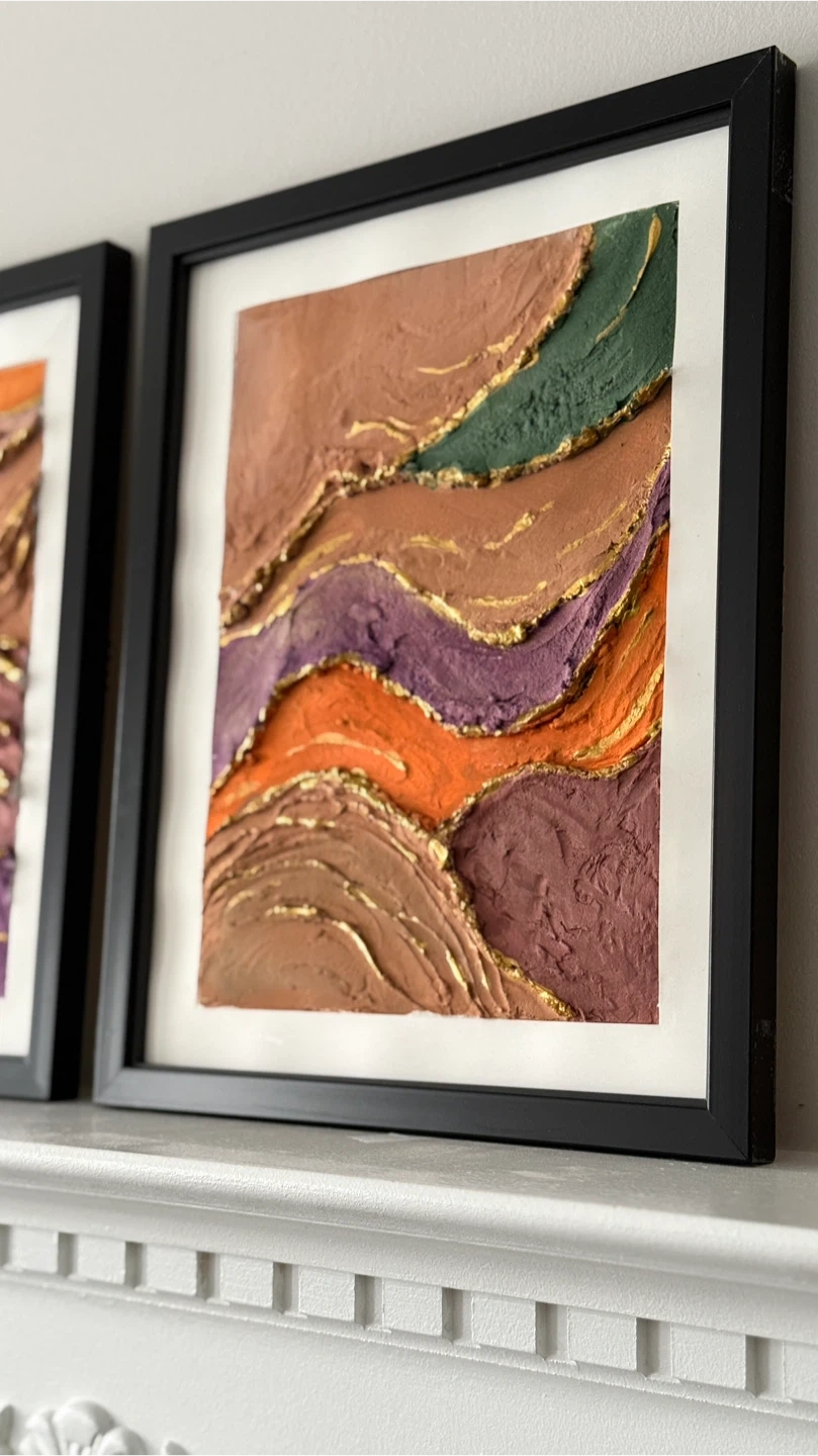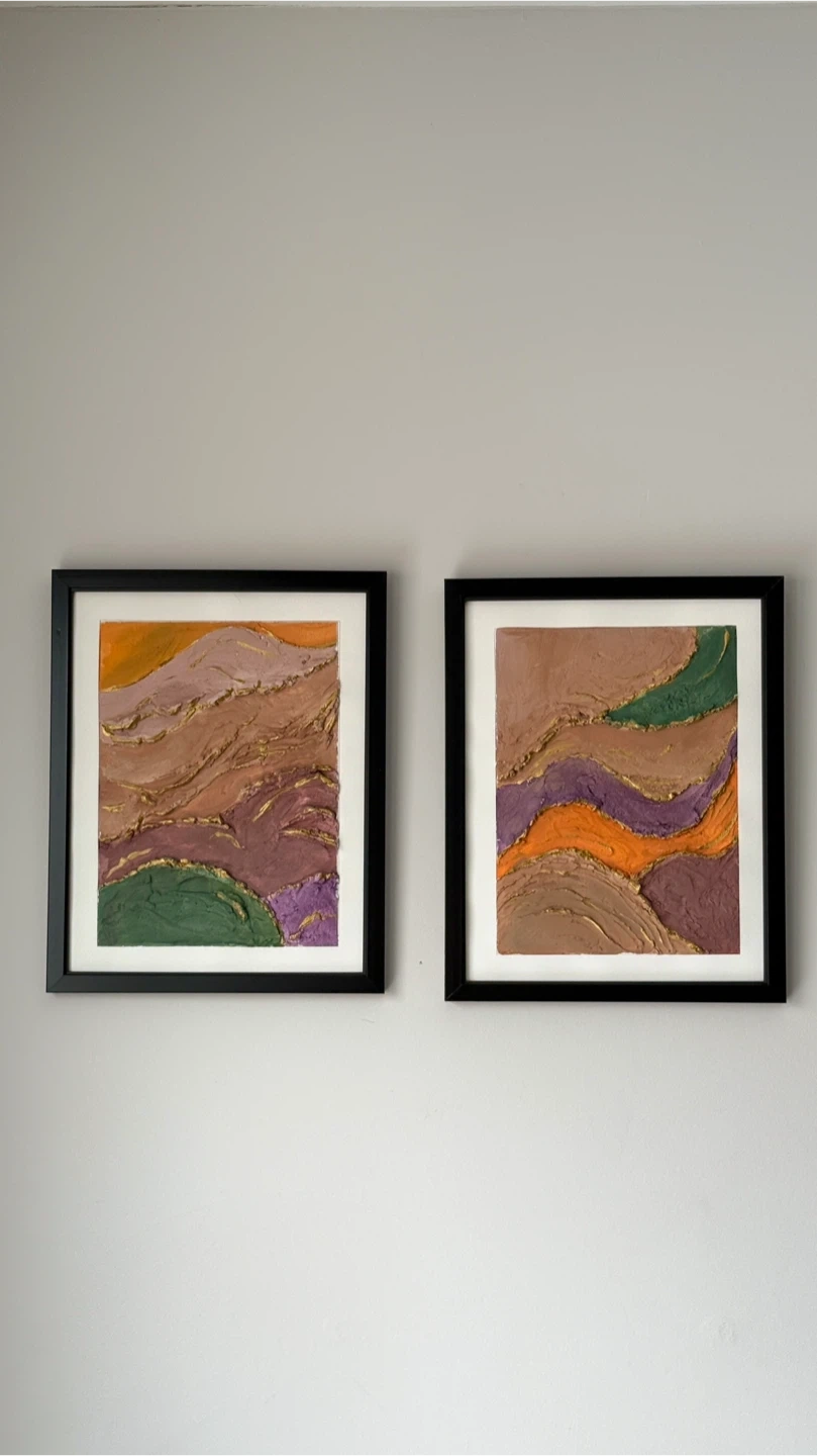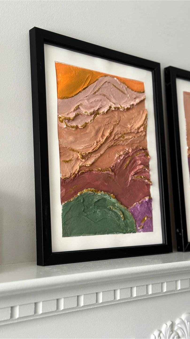 A set of two framed textured wall art pieces. Each features a unique layered landscape design with earth tones and gold accents. Perfect for adding a touch of modern art to your space!