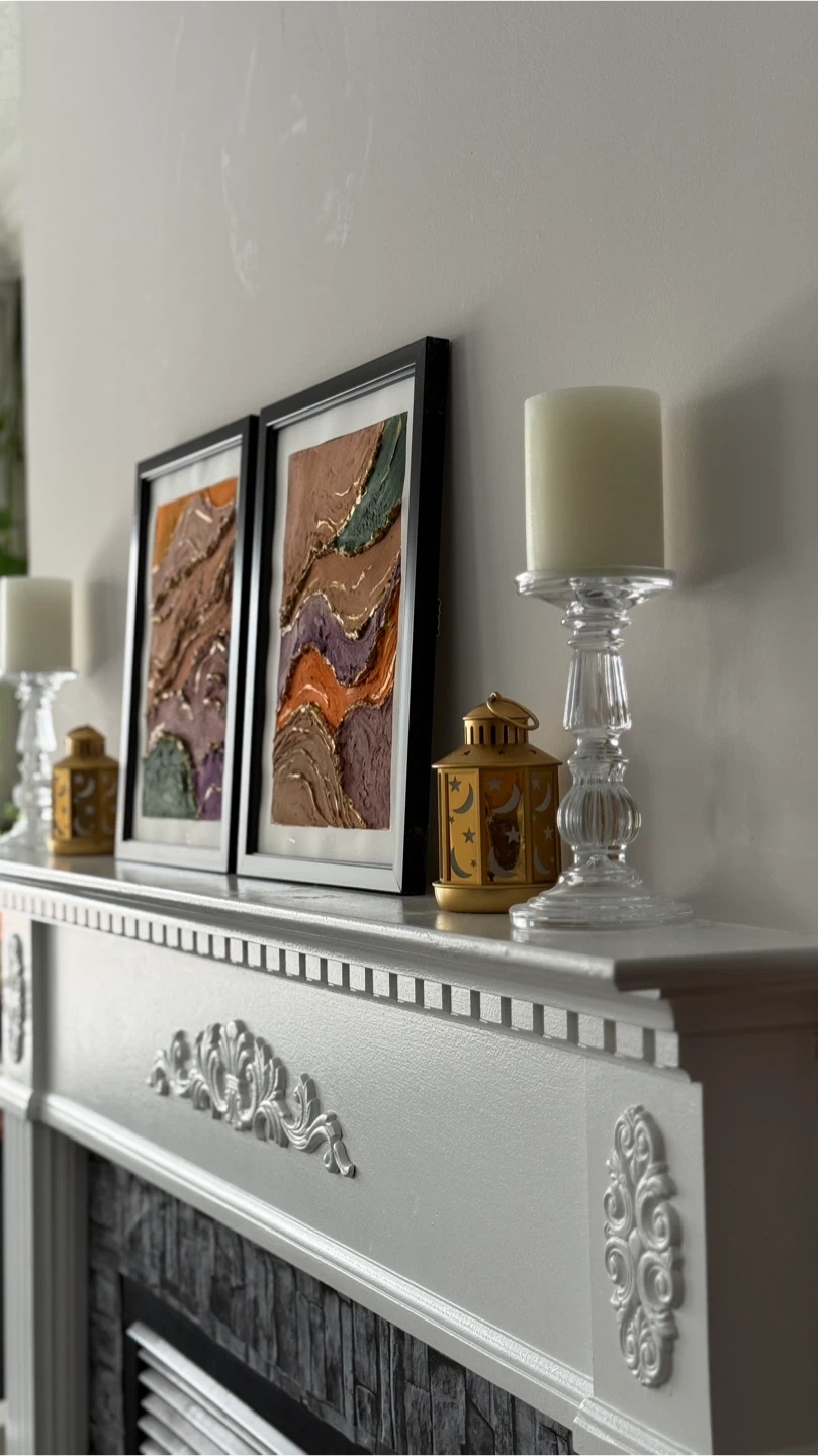 A set of two framed textured wall art pieces. Each features a unique layered landscape design with earth tones and gold accents. Perfect for adding a touch of modern art to your space!