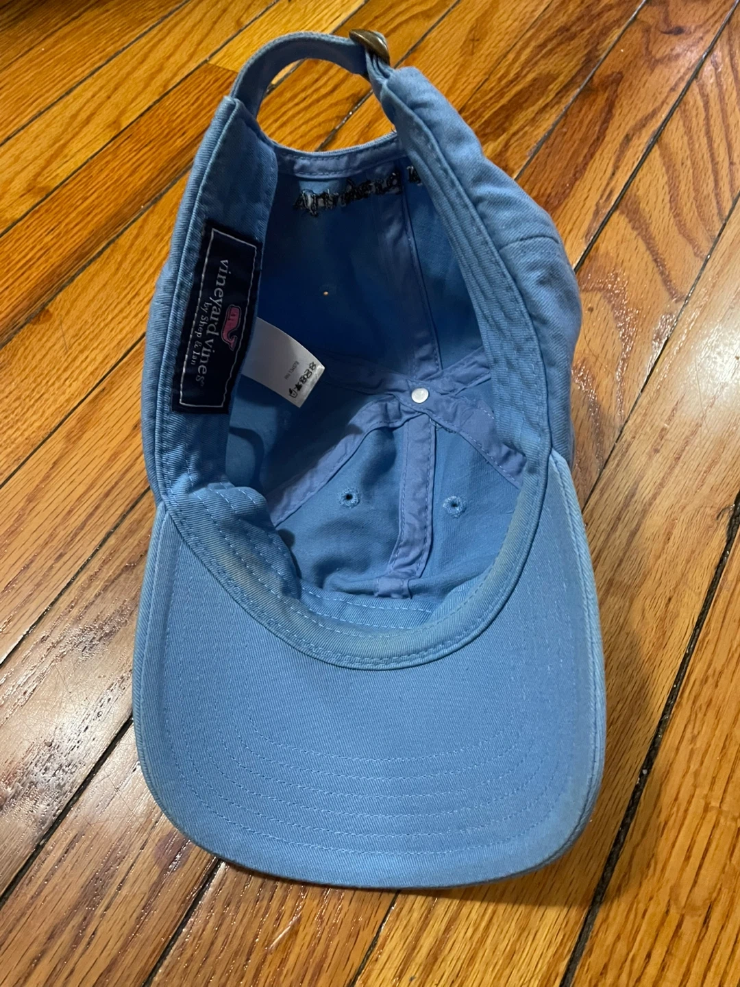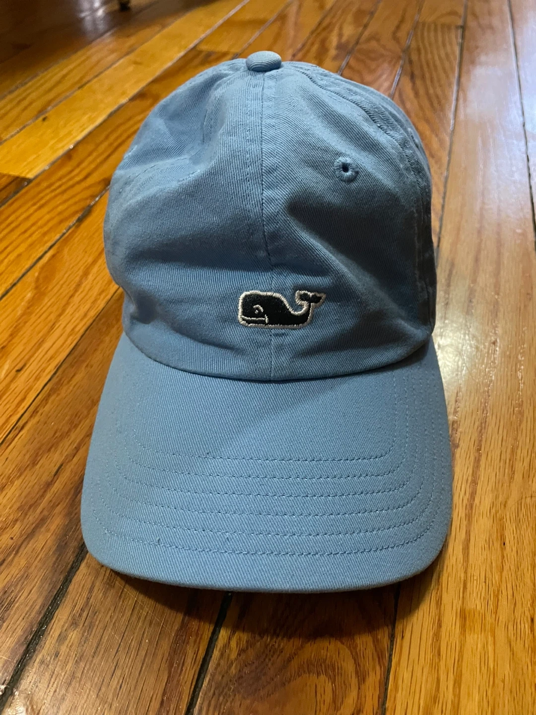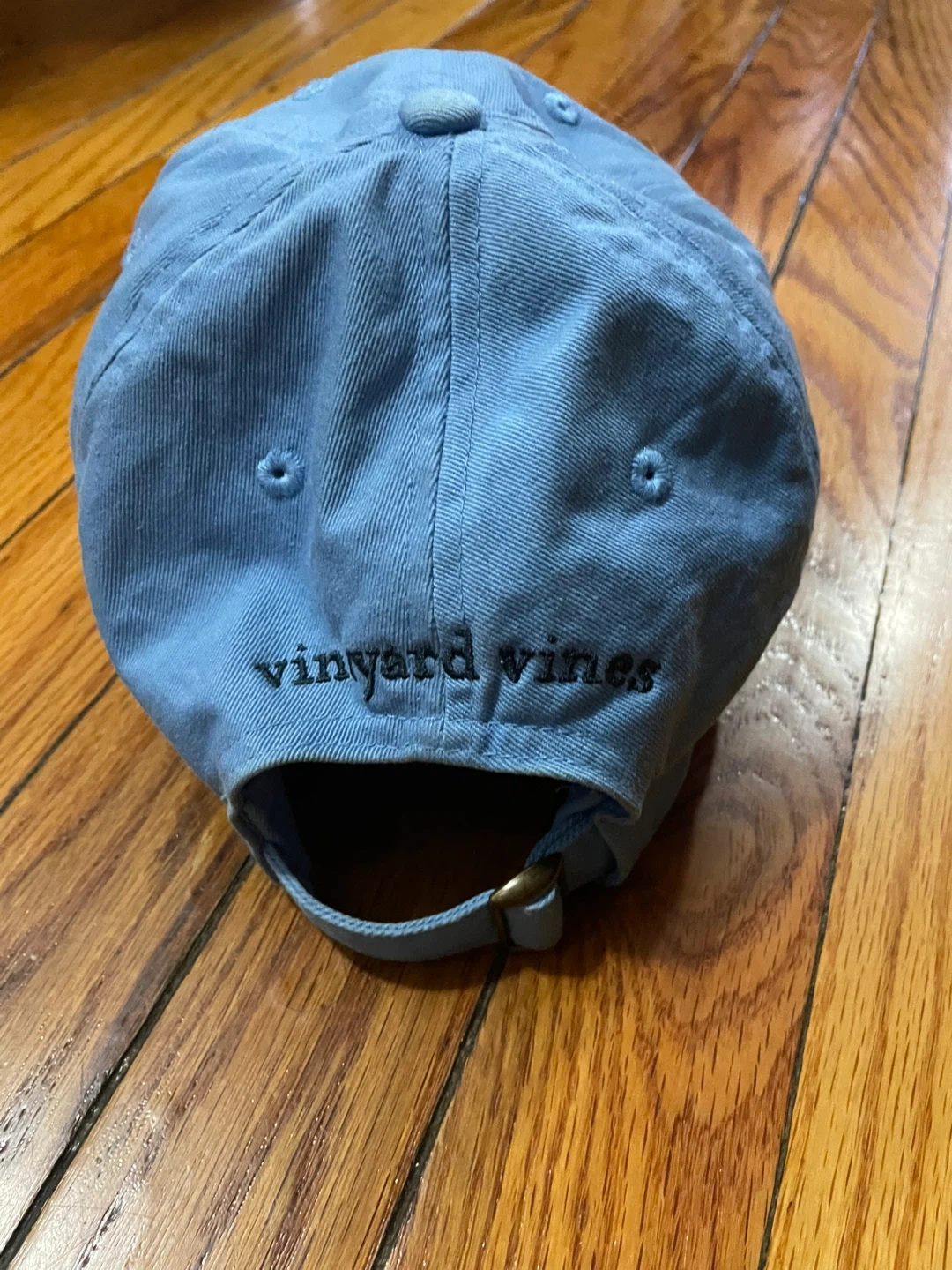 This is a blue Vineyard Vines baseball cap. It features the iconic whale logo embroidered on the front and "vineyard vines" embroidered on the back. Adjustable strap for a comfortable fit. Cotton material.