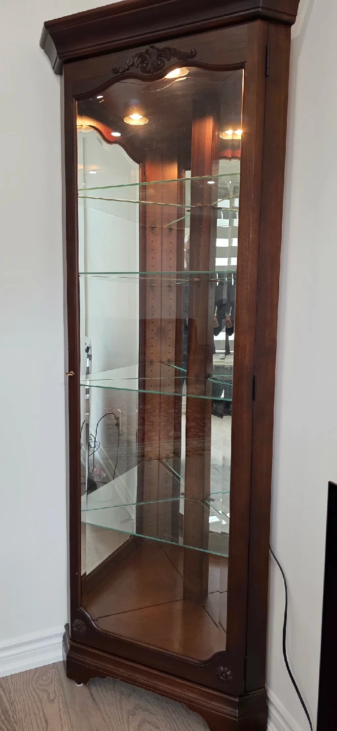 Selling a lovely corner curio cabinet with a dark wood finish! It features glass shelves and a mirrored back, perfect for displaying your favourite collectibles or decor items. The cabinet is in great condition and has a built-in light to showcase your items beautifully. It's a stylish piece that will fit nicely into any corner of your home!