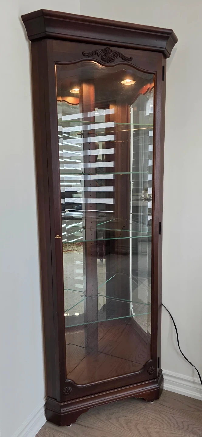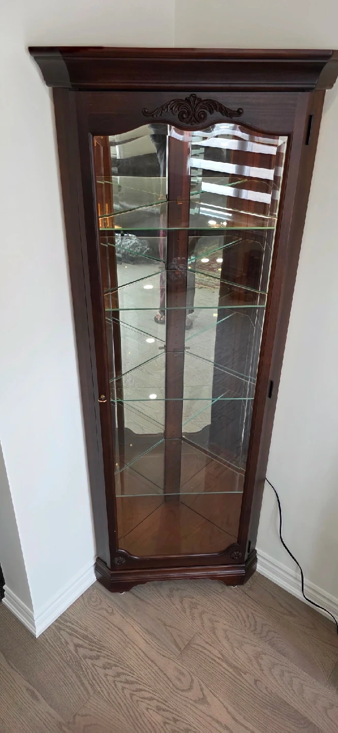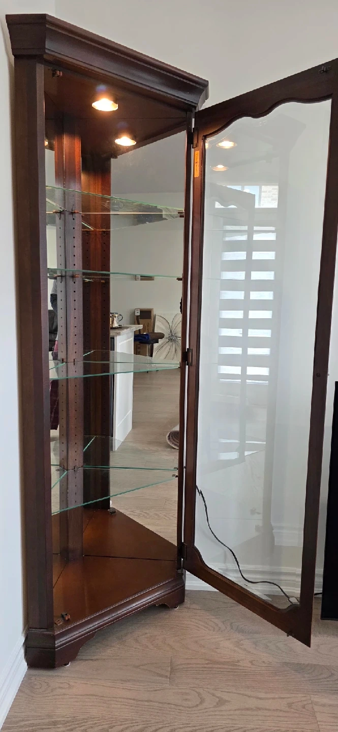Selling a lovely corner curio cabinet with a dark wood finish! It features glass shelves and a mirrored back, perfect for displaying your favourite collectibles or decor items. The cabinet is in great condition and has a built-in light to showcase your items beautifully. It's a stylish piece that will fit nicely into any corner of your home!