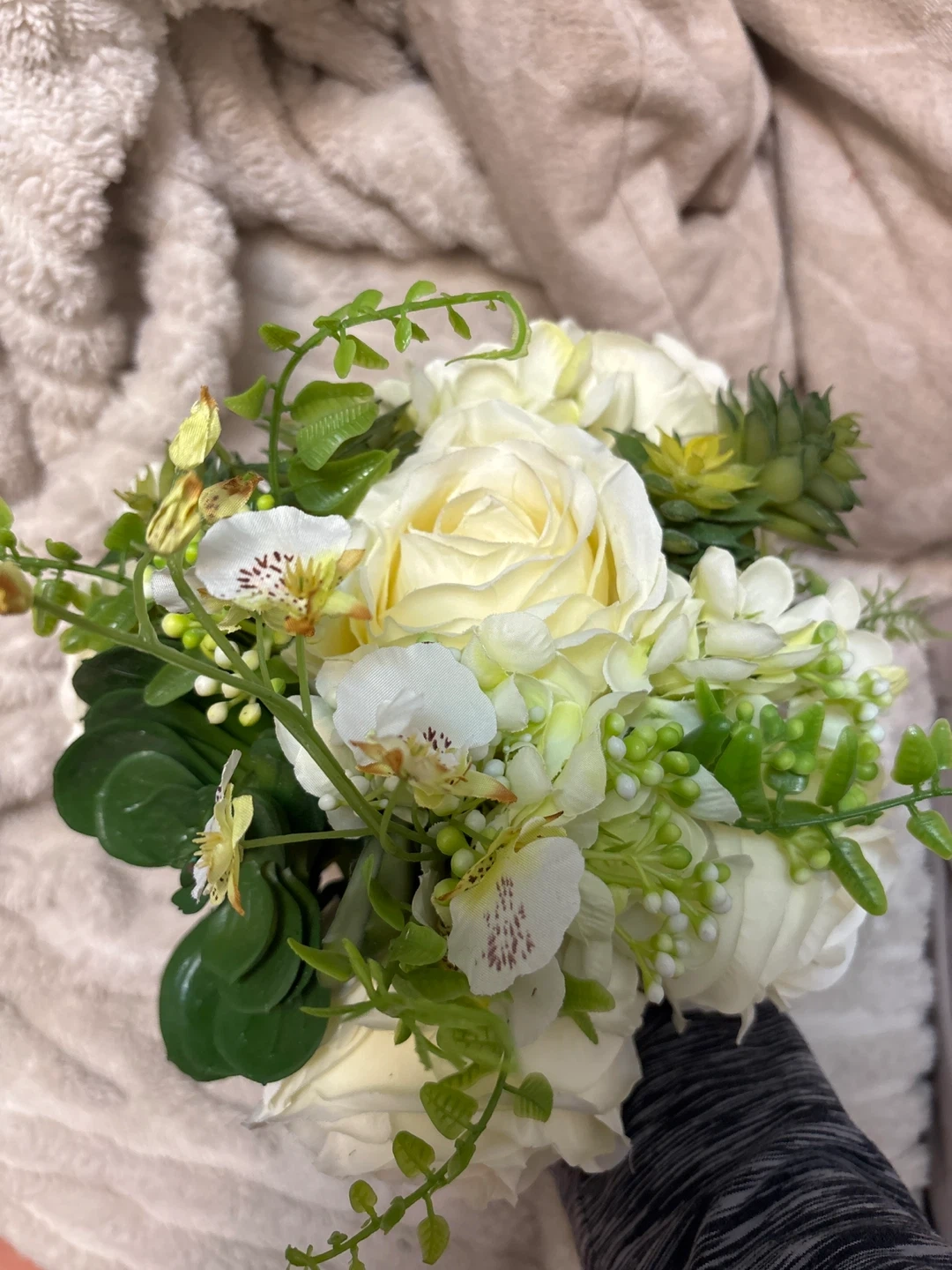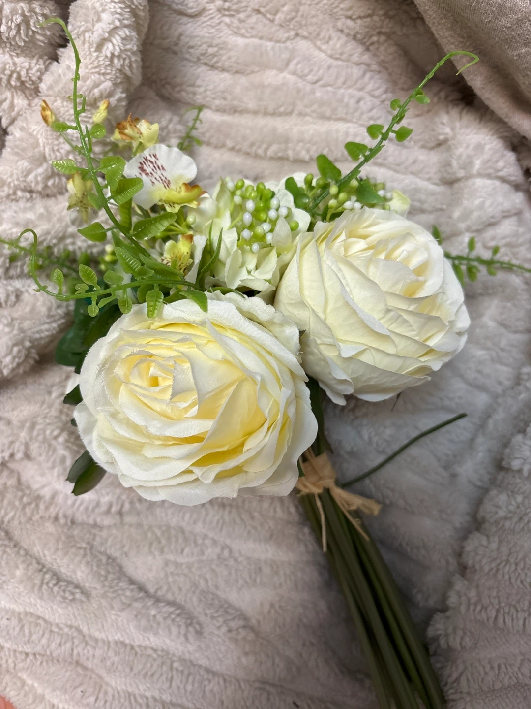 This charming artificial flower bouquet features white roses and various green foliage. It's tied with a twine bow at the stems. It'd make a lovely decorative piece for your home or for events!