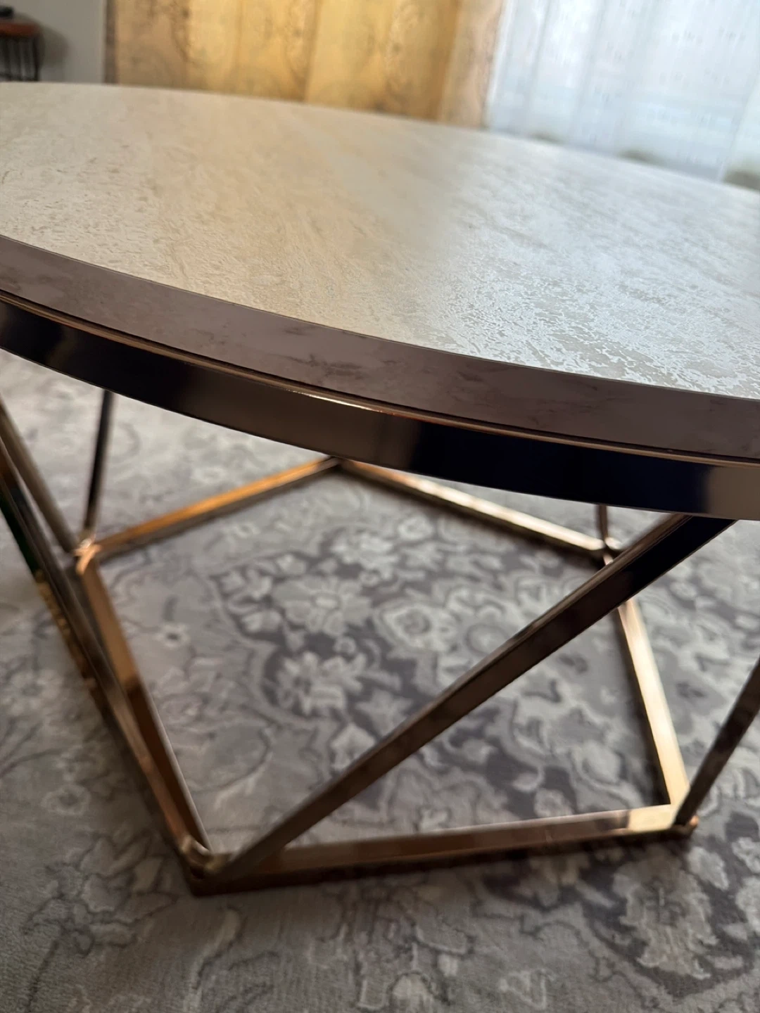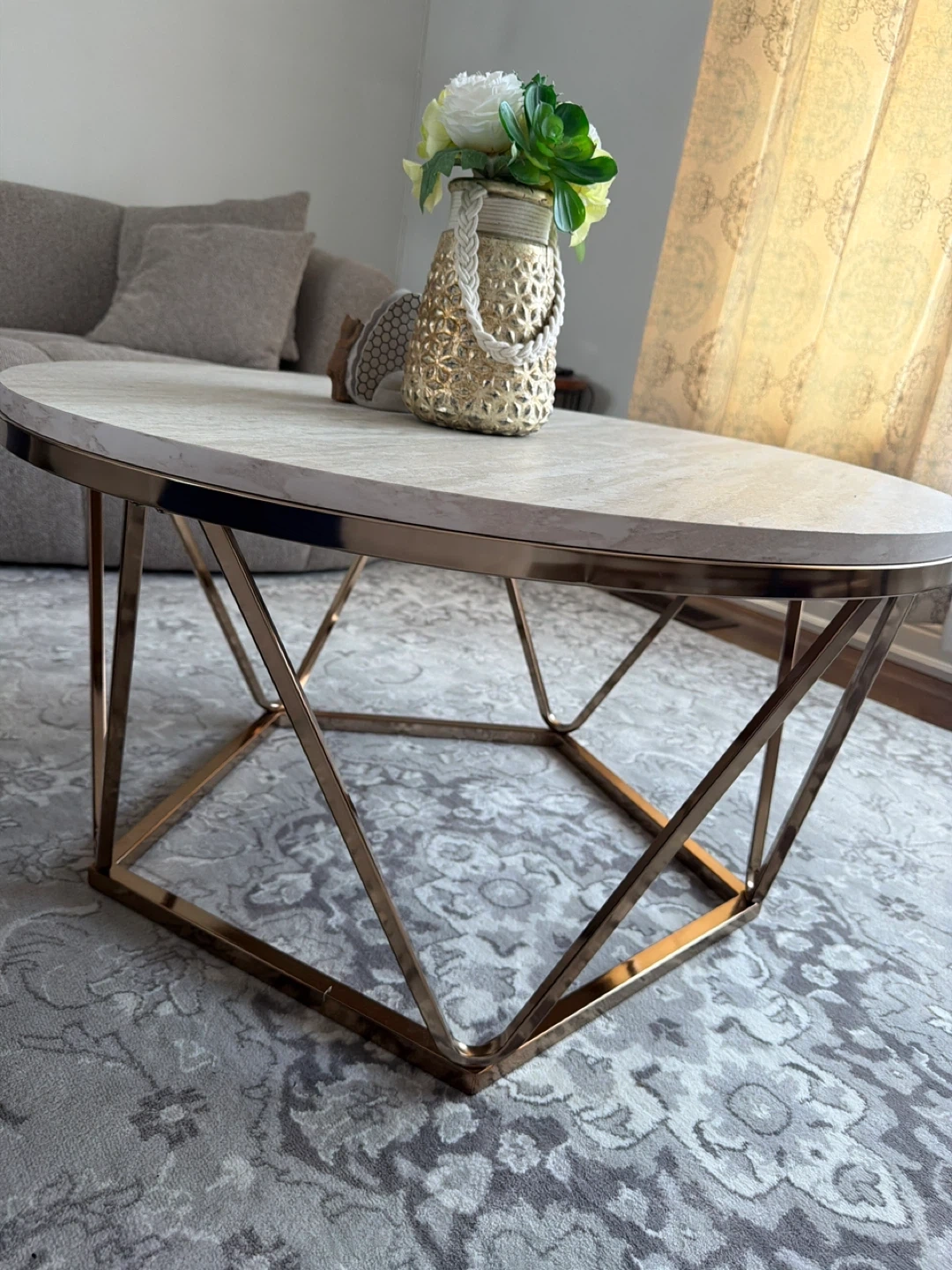 This oval coffee table features a wood top with a polished gold metal geometric base. It's a stylish addition to any living room. The tabletop is durable and easy to clean.