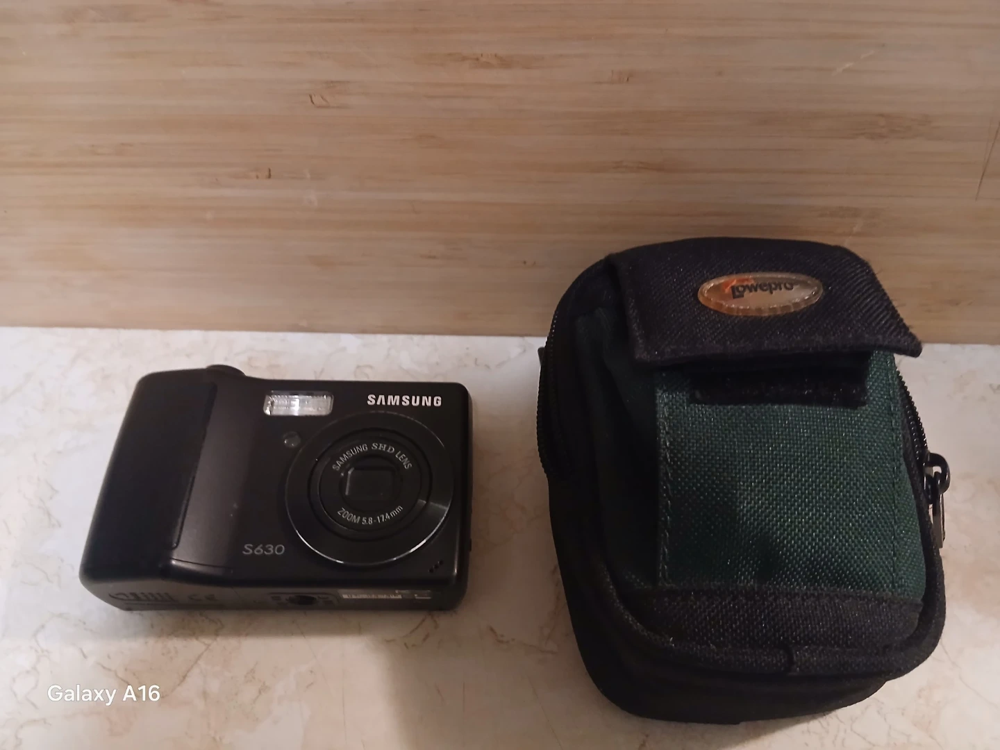 Black Samsung S630 digital camera with a 5.8-17.4mm zoom lens. It comes with a green and black Lowepro carrying case. A great little camera for everyday snaps!
