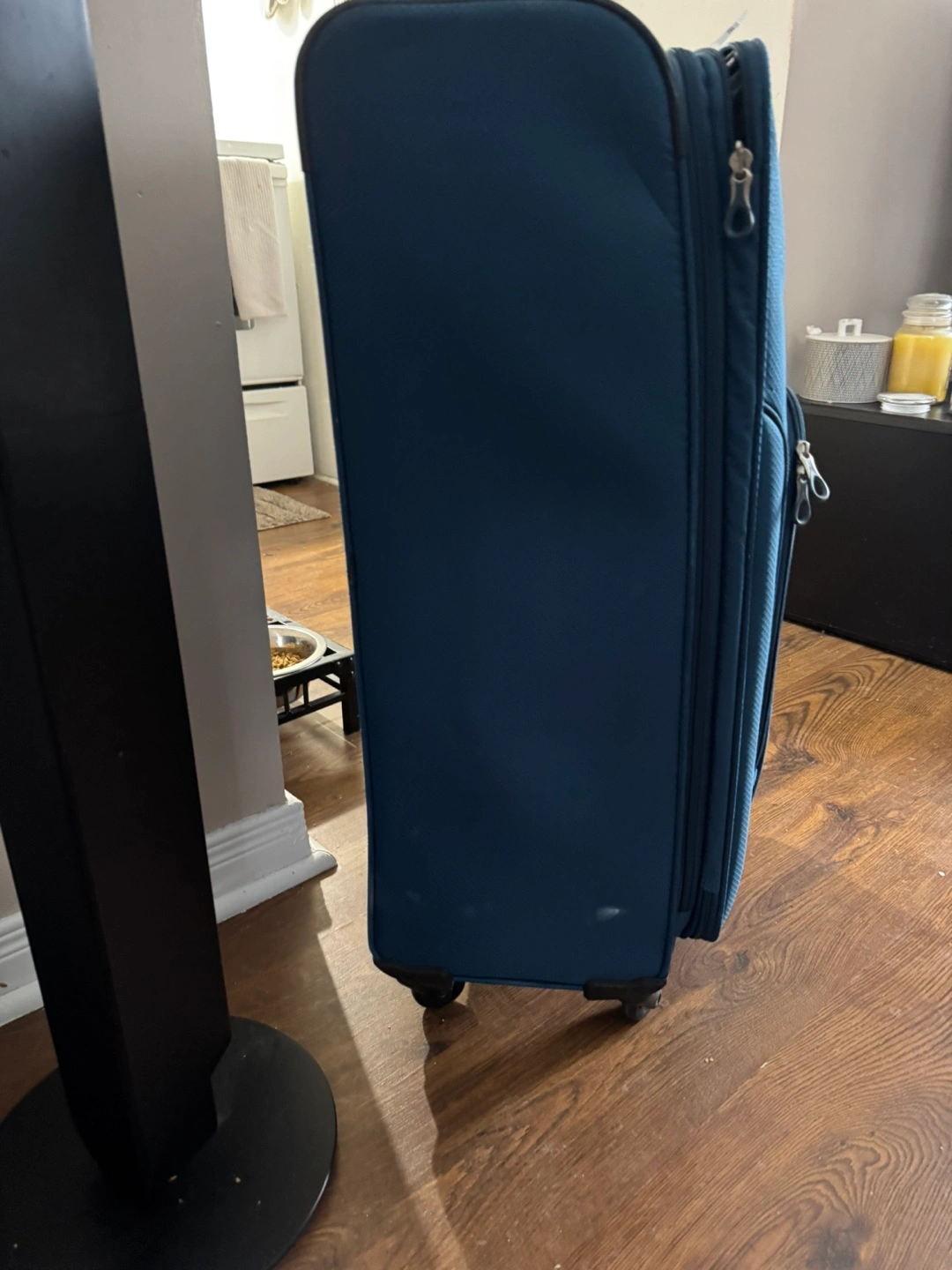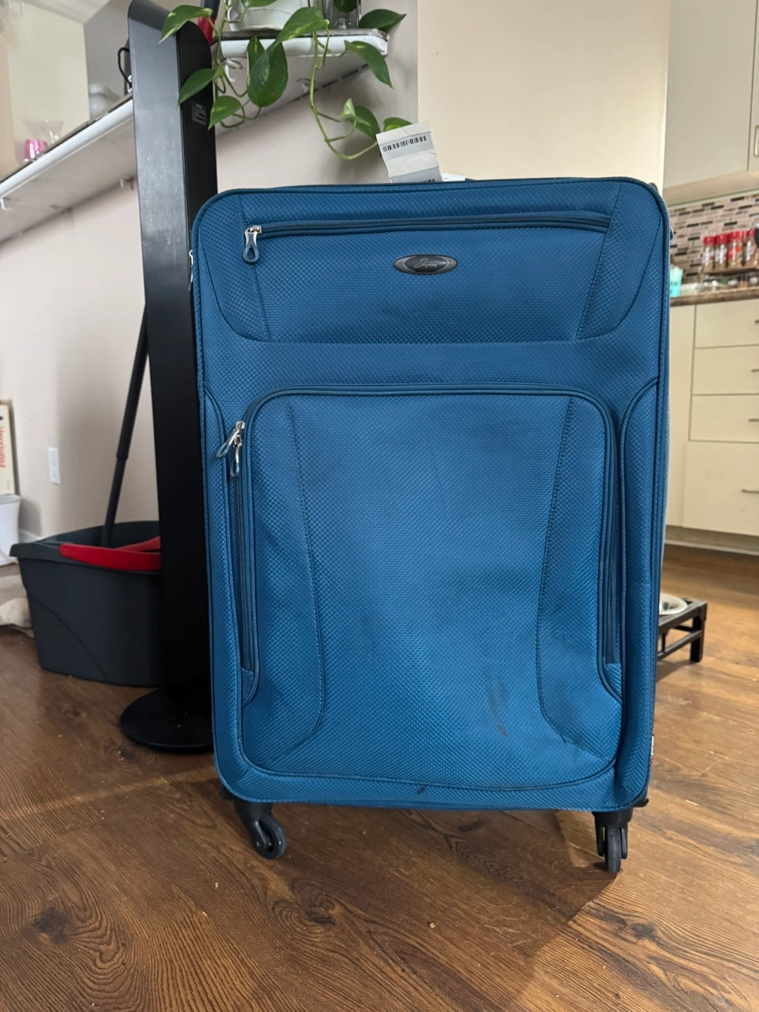 Large blue rolling suitcase. Four wheels. Multiple compartments. Shows minor wear. Good used condition.