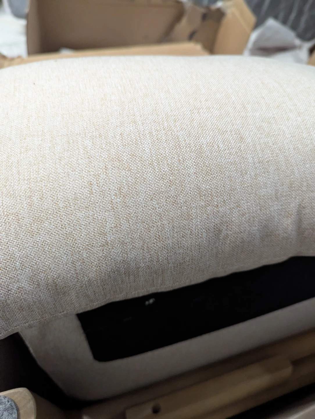 A comfortable accent armchair featuring a light beige fabric upholstery and a natural wood frame. It includes a matching lumbar pillow for added support. The overall dimensions are 32" deep by 26" wide and 29" high.