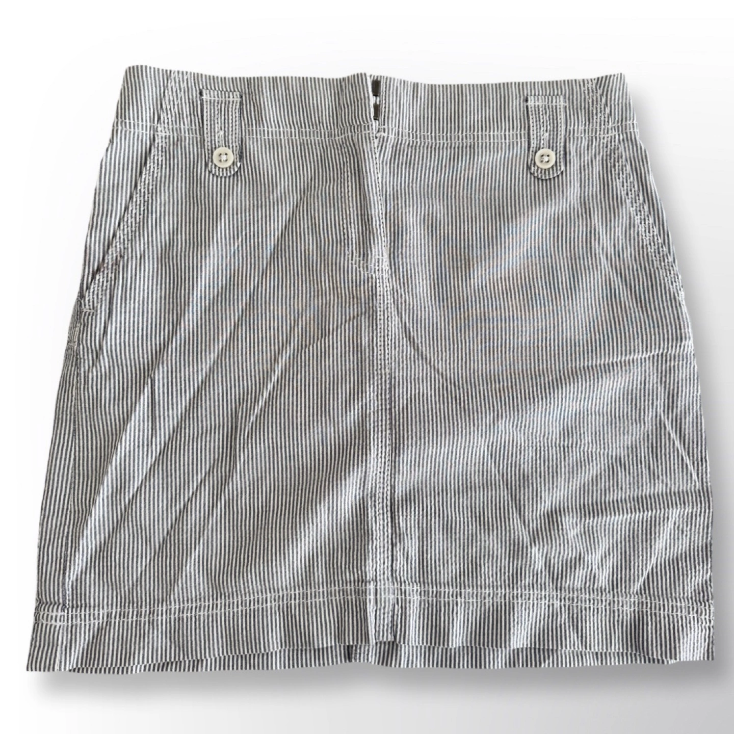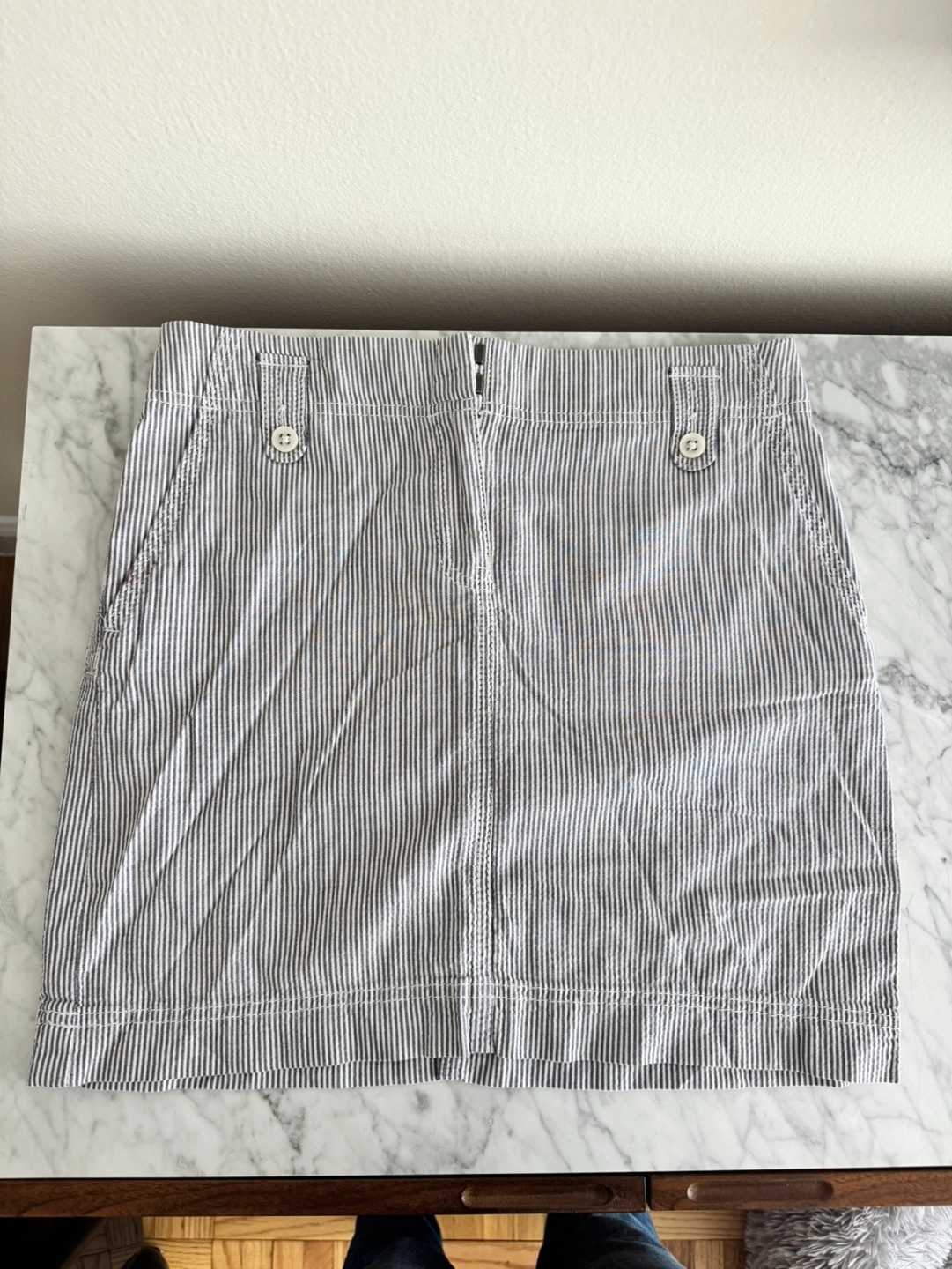 Blue and white searsucker mini skirt. Size 2. Two pockets. Button closure.