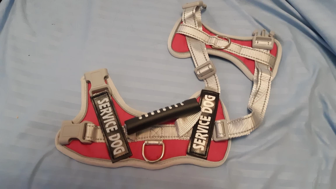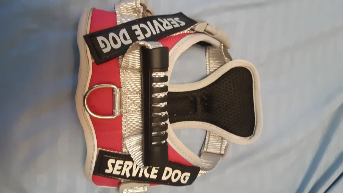 Dark Pink and grey service dog harness. size small. fits more like sm to medium. Features multiple adjustable straps. Includes patches that read service dog. A perfect item for you and your furry companion. my location near Southgate mall