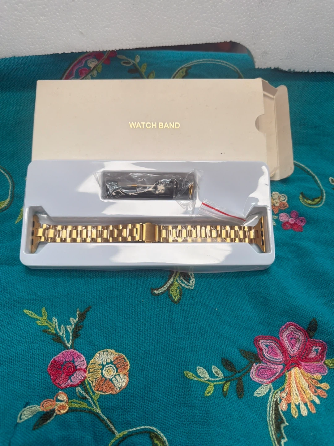 This is a gold-colored metal watch band. It's in its original packaging. Includes tools for adjustment.