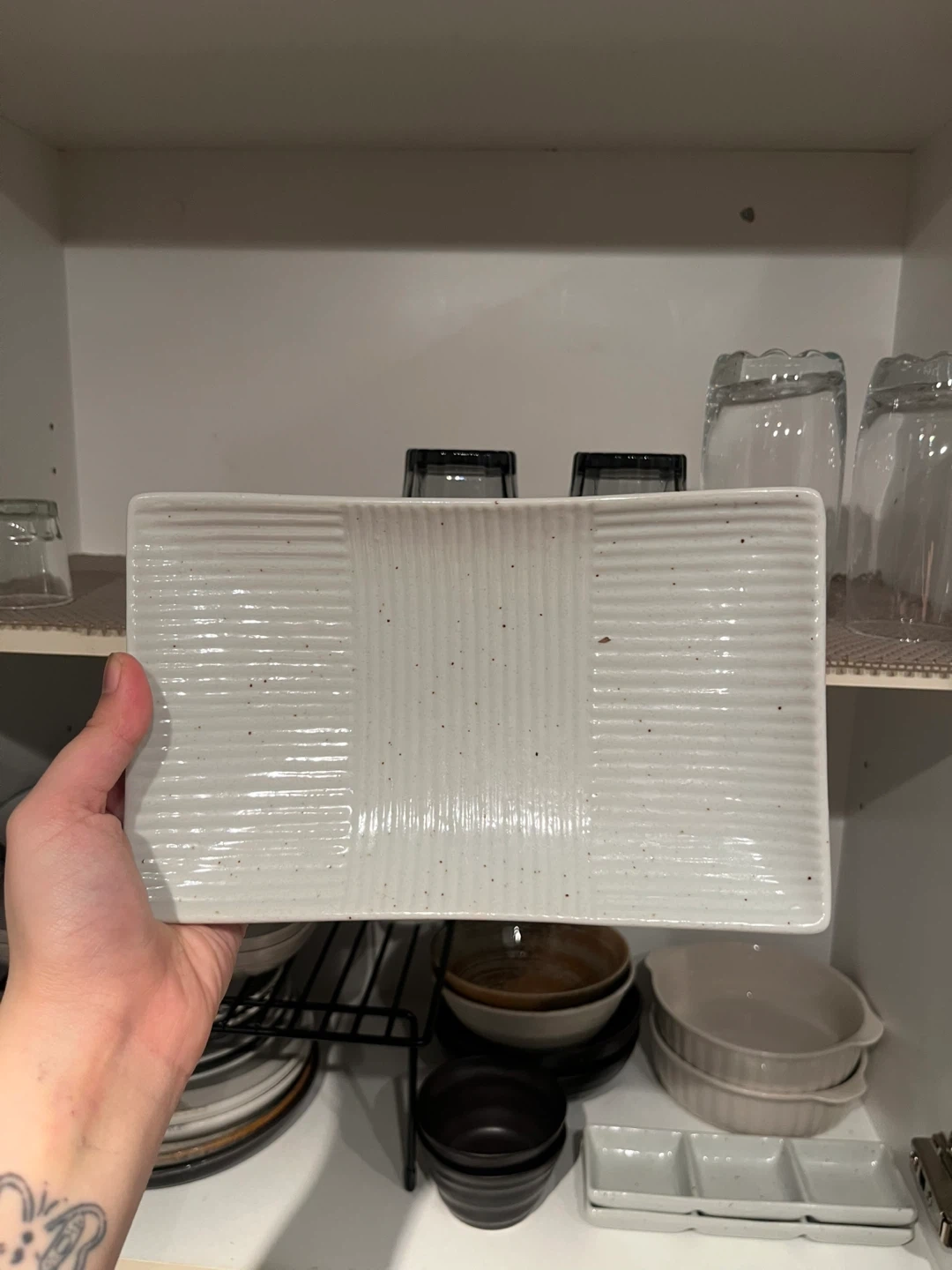 This is a light grey rectangular serving dish with a textured pattern. It's made of ceramic. It's good for serving appetizer or side dishes. Made for anything, doesn’t have to be sushi. Very good quality.