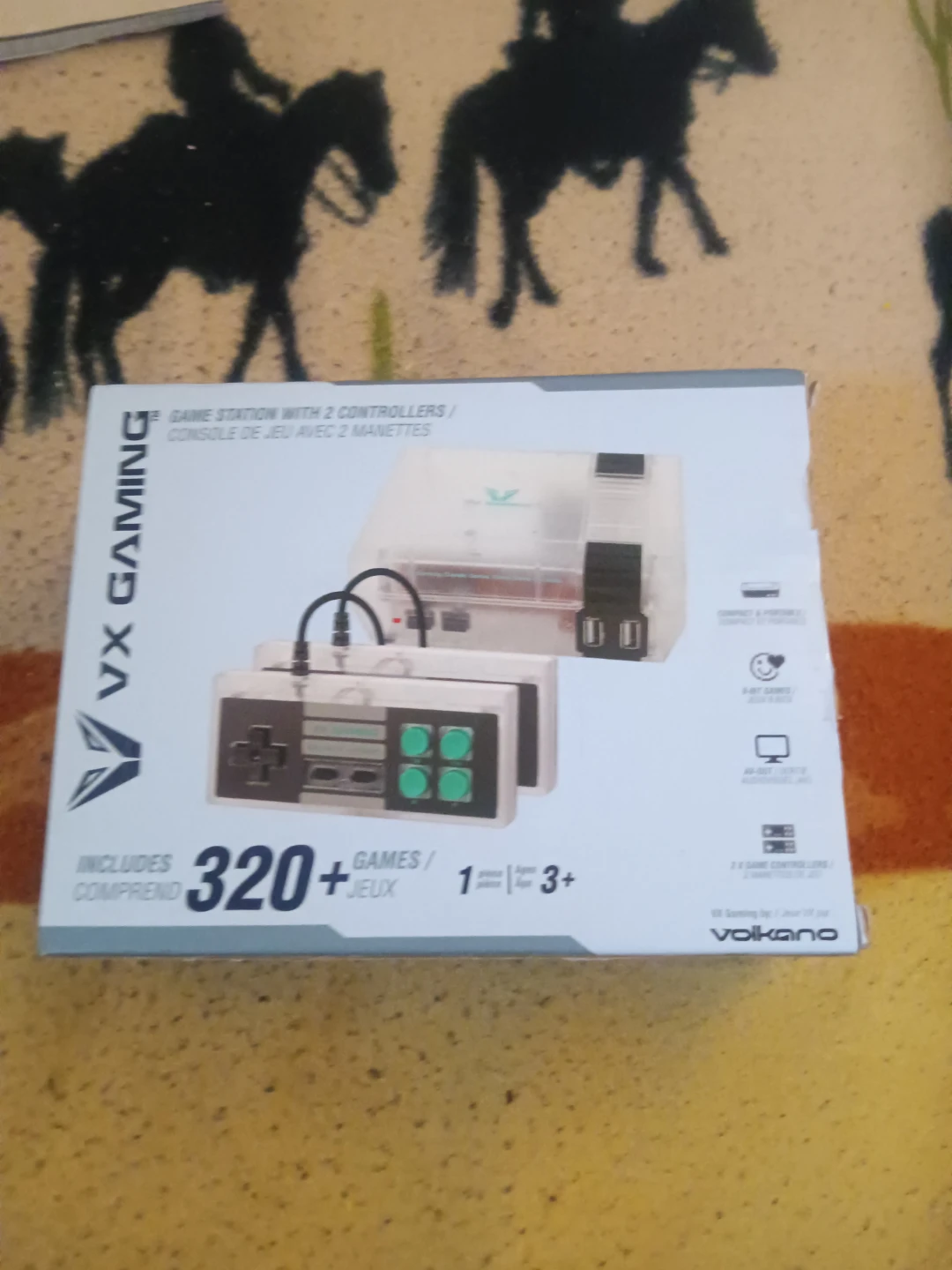 This VX Gaming Game Station comes with 2 controllers and includes over 320 games. It connects via AV cables and a power adapter is included. It's great for retro gaming fun!