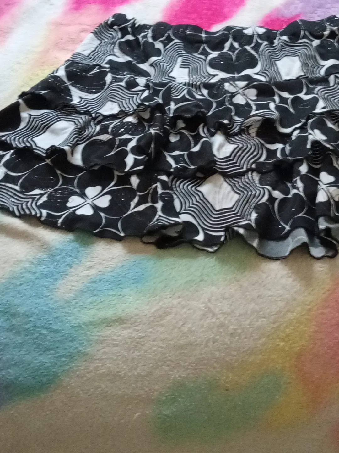 This is a tiered ruffled skirt with a black and white abstract floral pattern. Elastic waistband for a comfy fit. Skirt material is lightweight.