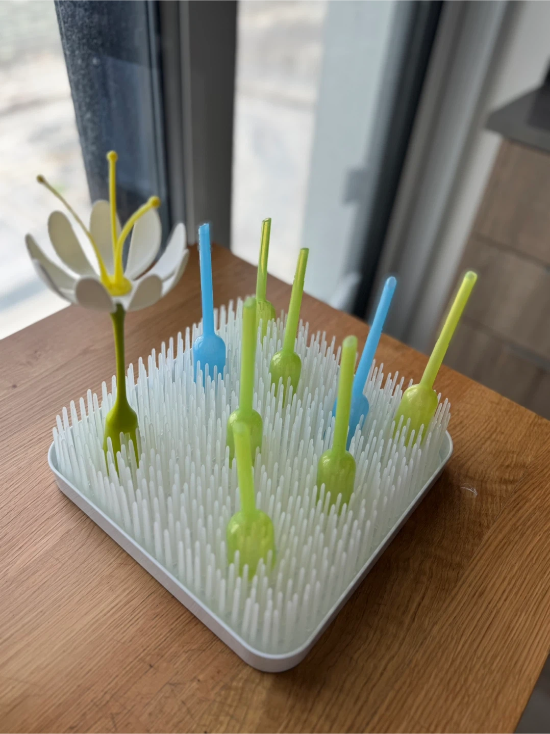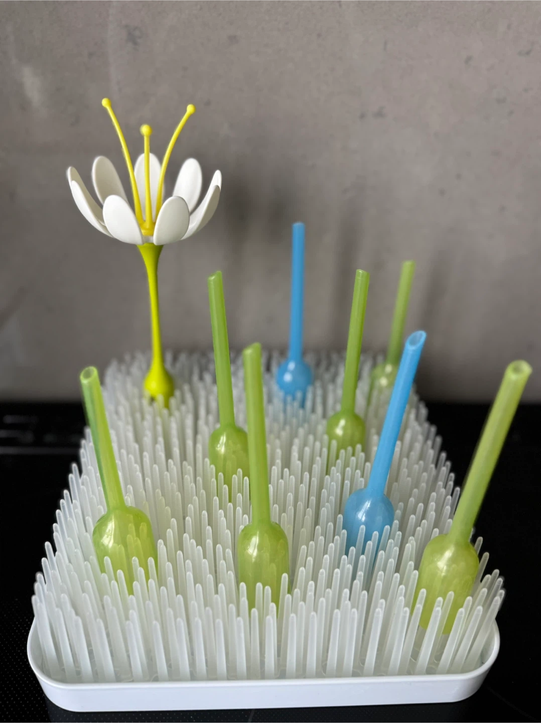 Keep your baby bottles and accessories organized with this Boon Grass countertop drying rack! Its flexible blades hold items of all shapes and sizes, and the stylish design looks great in any kitchen.