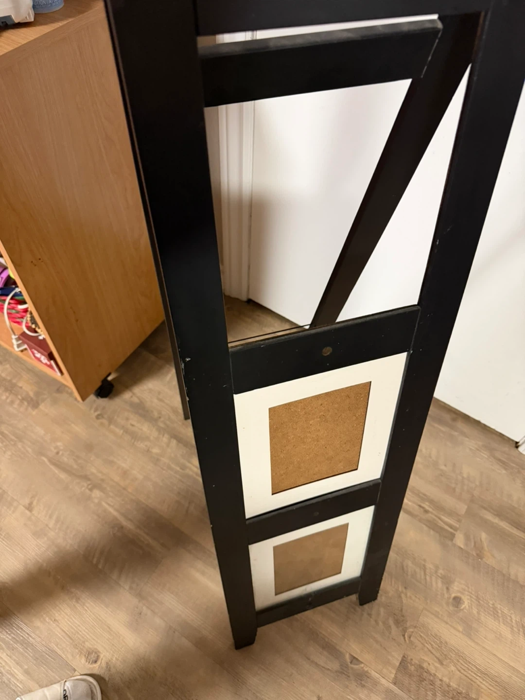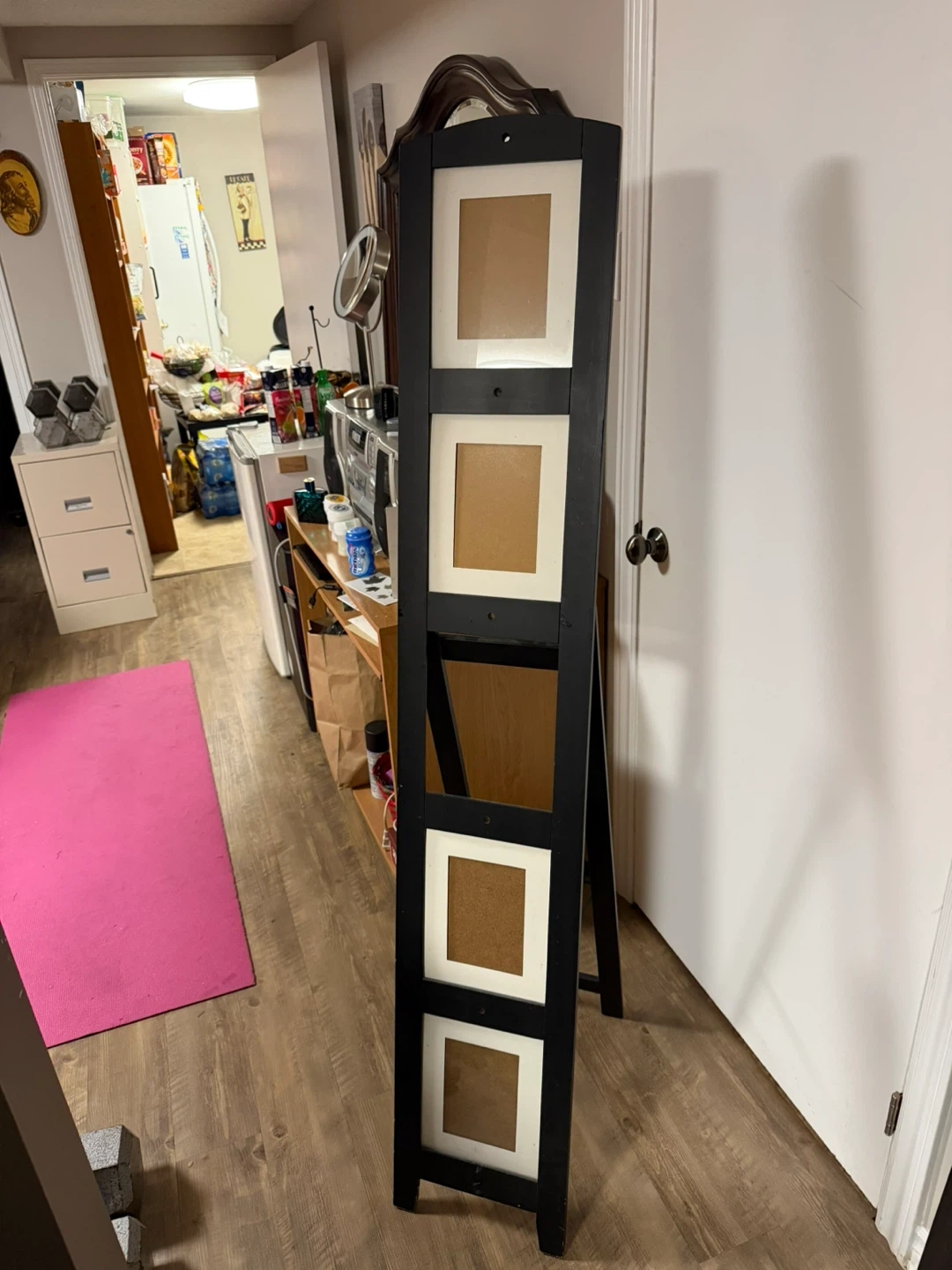 This black standing photo collage frame has four openings. The openings include two larger top slots and two smaller bottom slots. It's a freestanding unit. Middle missing can be left alone or find a replacement at the thrift store or creativity add something 5/3 inch tall