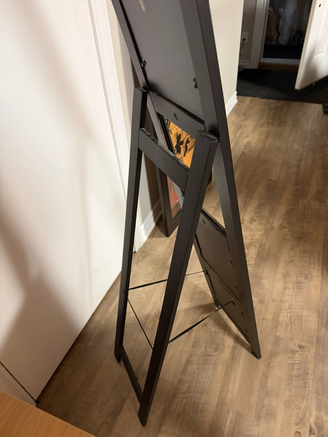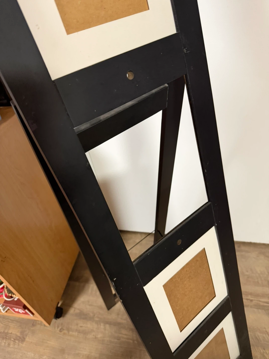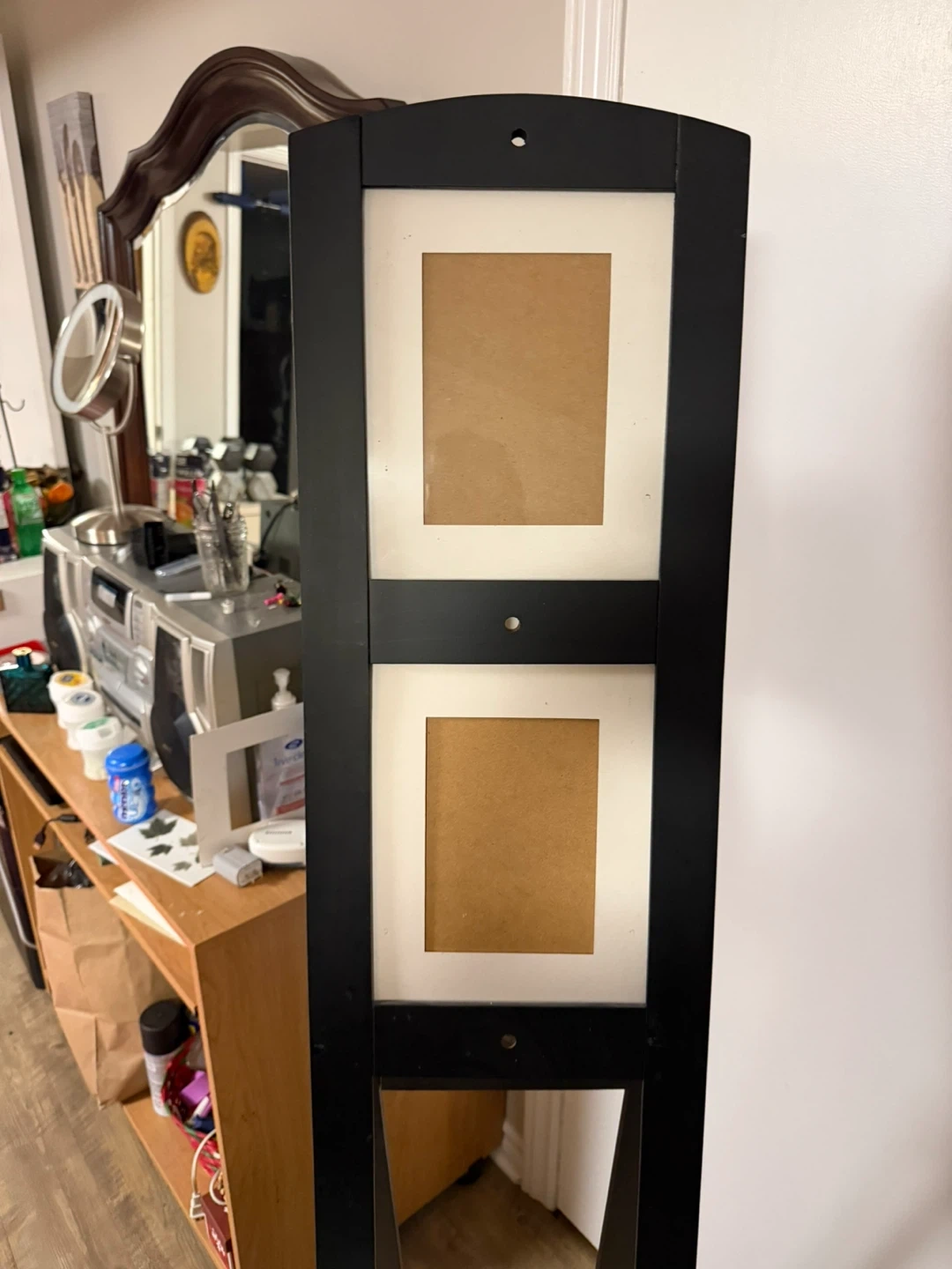 This black standing photo collage frame has four openings. The openings include two larger top slots and two smaller bottom slots. It's a freestanding unit. Middle missing can be left alone or find a replacement at the thrift store or creativity add something 5/3 inch tall