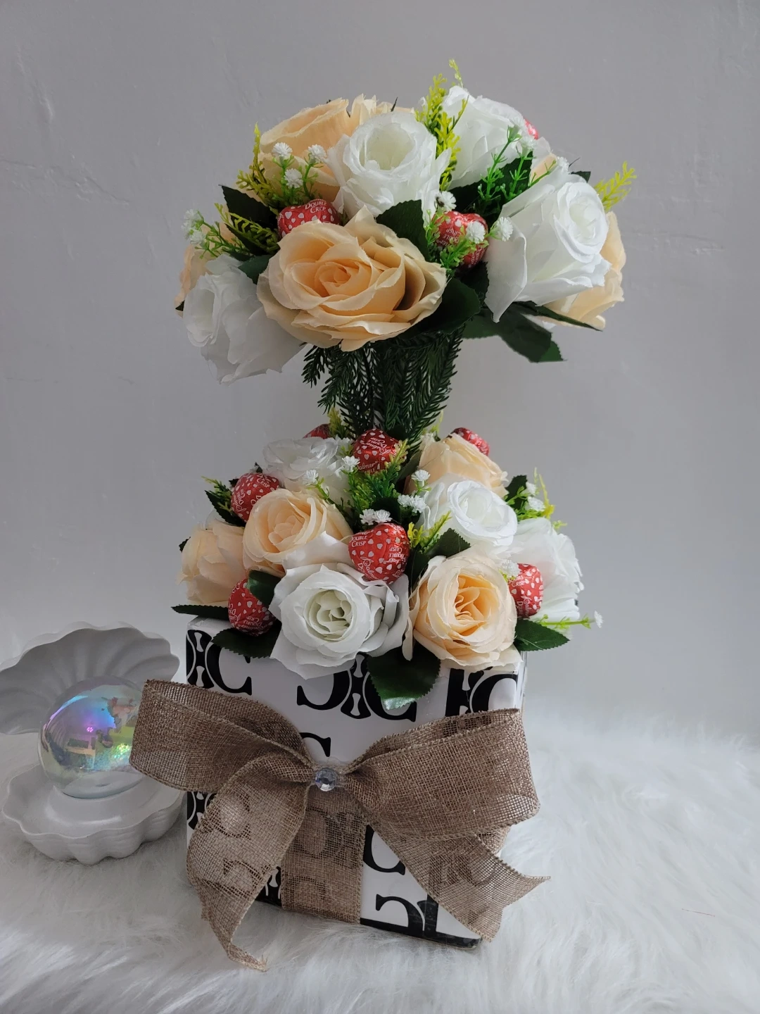 This decorative arrangement features artificial roses in cream and peach tones, accented with small red and white decorative elements. It's presented in a patterned box with a burlap bow. This piece adds a touch of color to any indoor space.