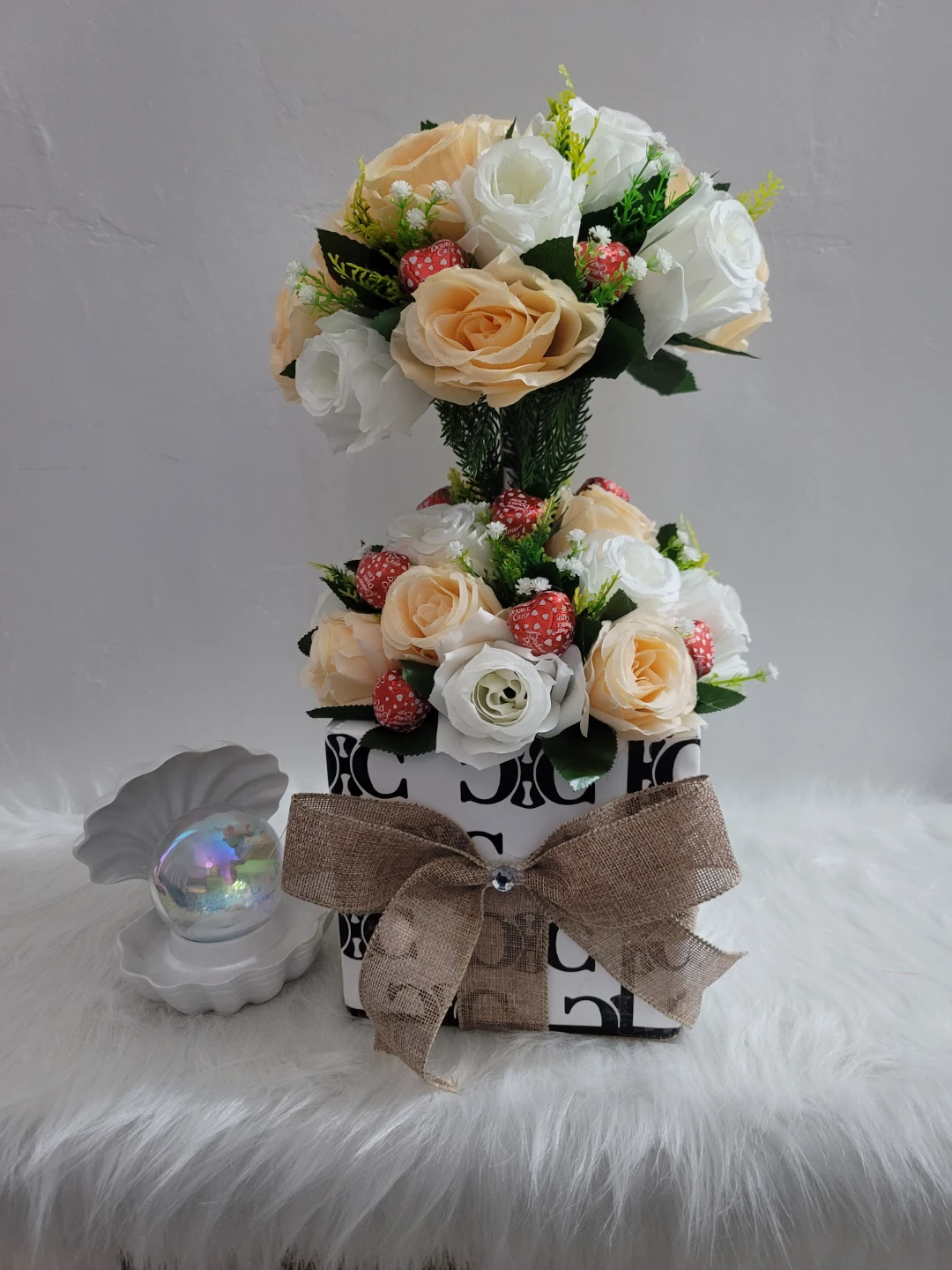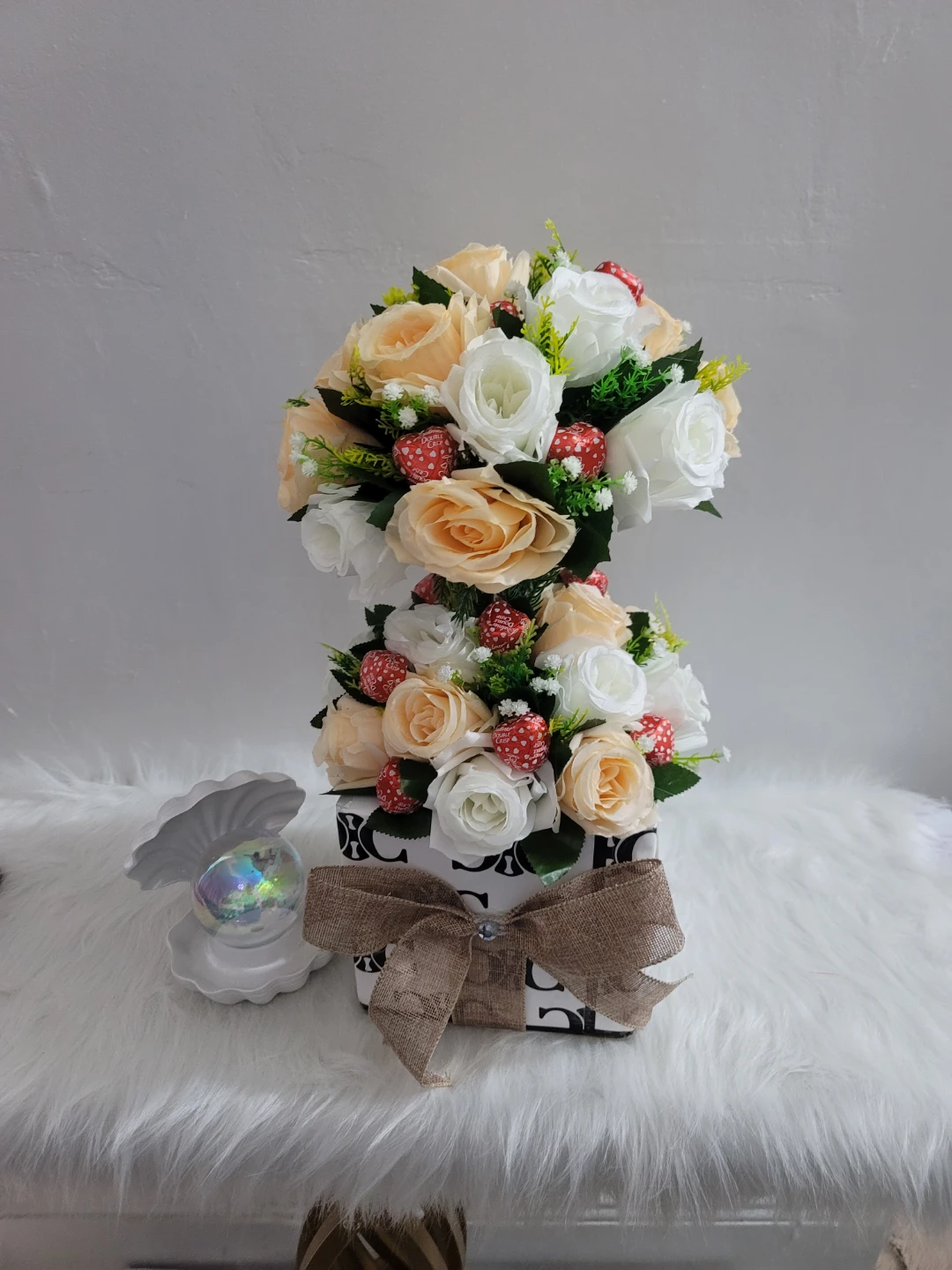 This decorative arrangement features artificial roses in cream and peach tones, accented with small red and white decorative elements. It's presented in a patterned box with a burlap bow. This piece adds a touch of color to any indoor space.