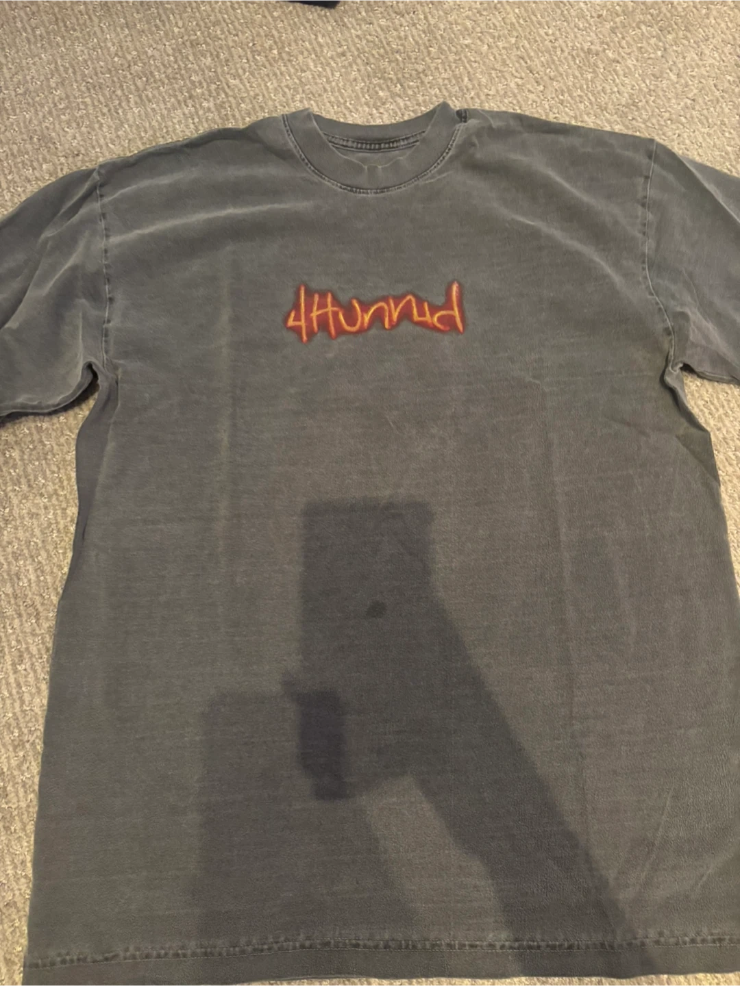 (Very small stain showed in slide 3)Grey graphic t-shirt with "4Hunnid" logo on the front and back. Features playing cards with flames graphic on the back. It's made of cotton.