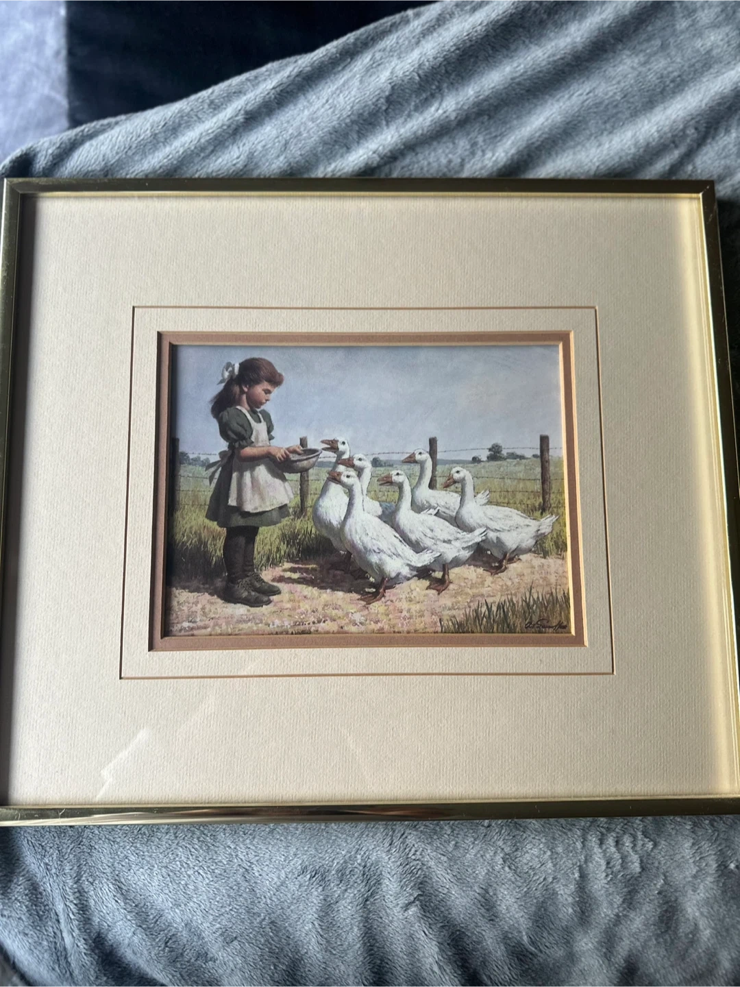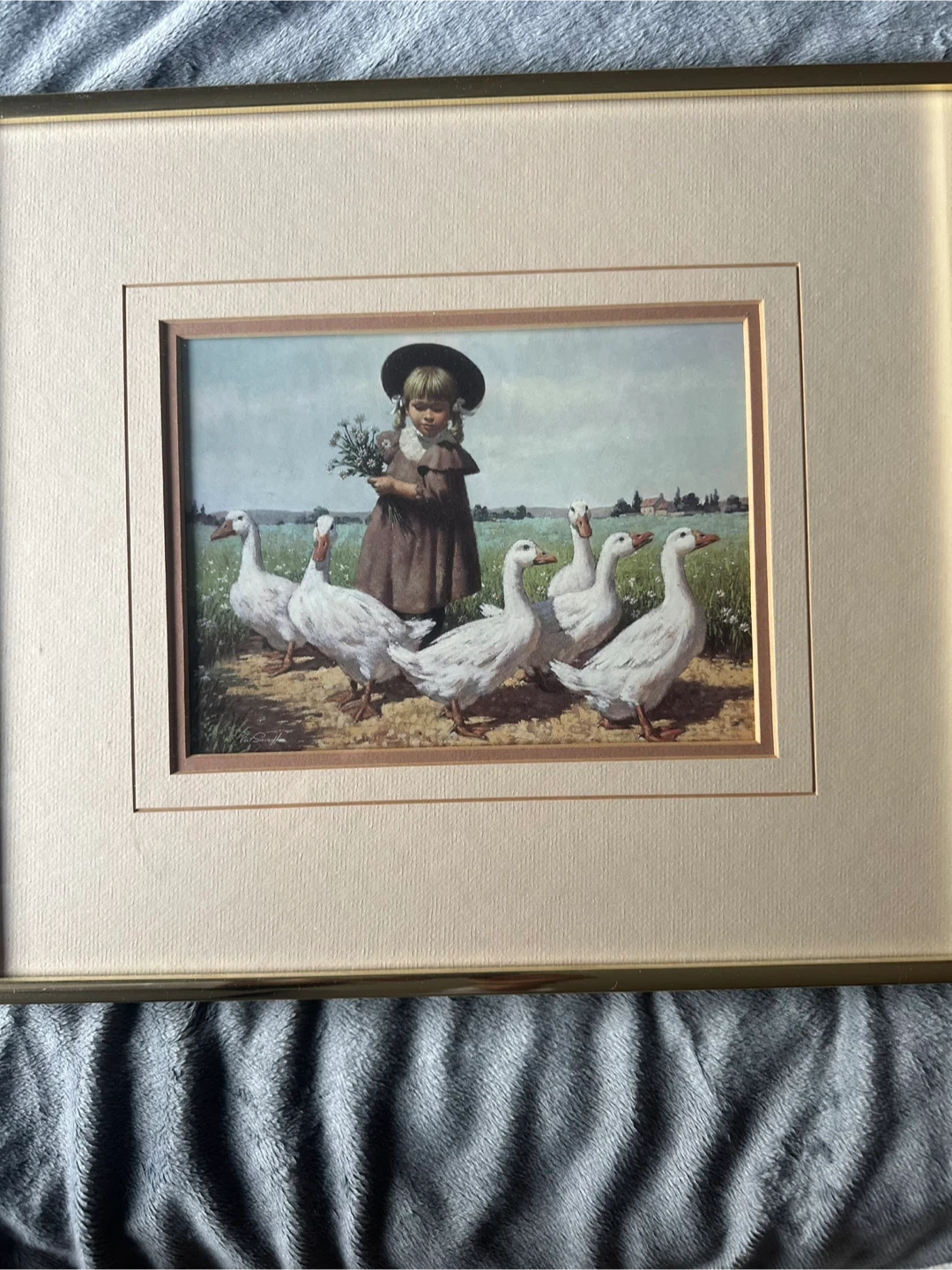 This framed artwork depicts a young girl in a field with several geese. It's matted and ready to hang. Adds a charming touch to any room!