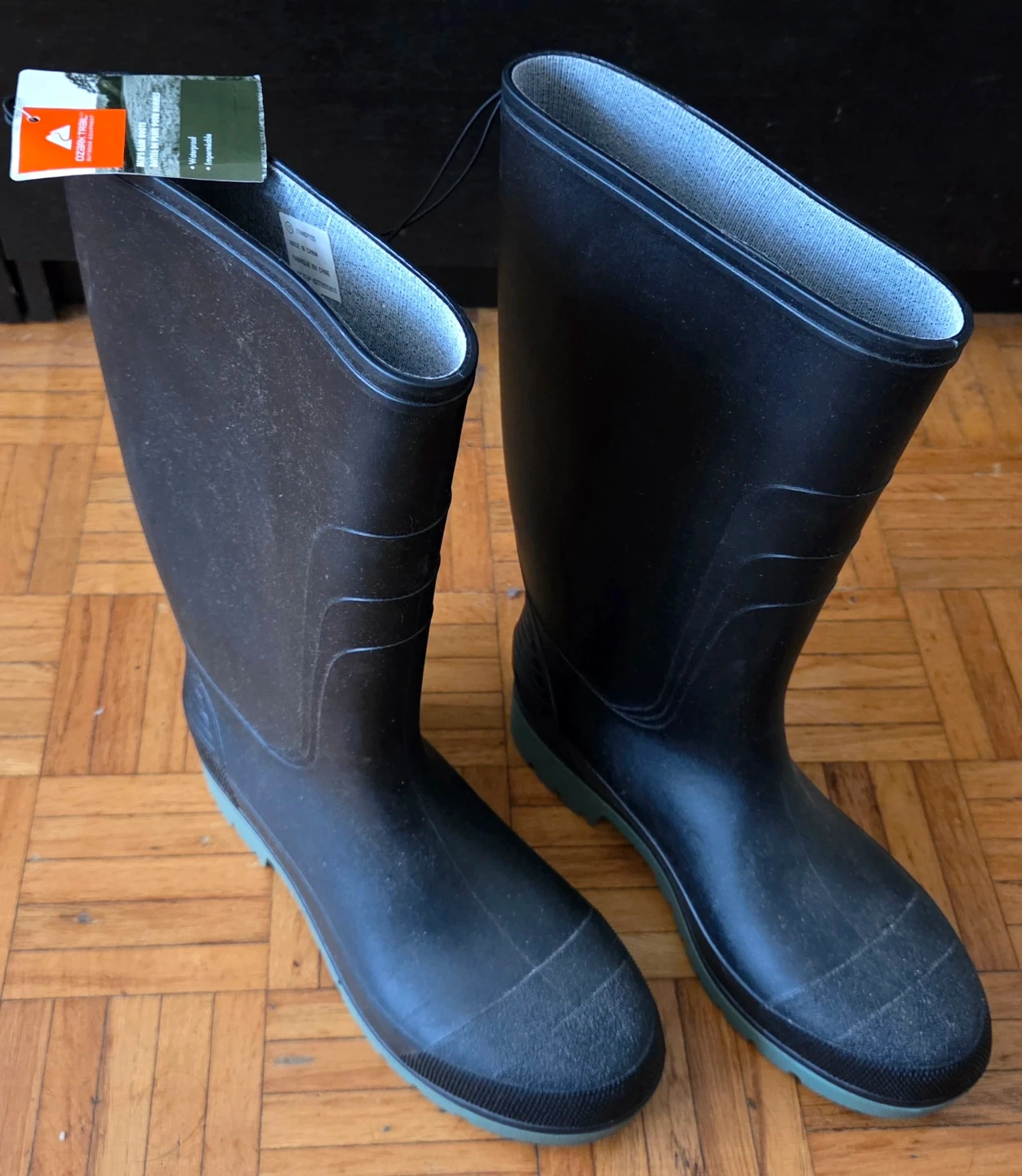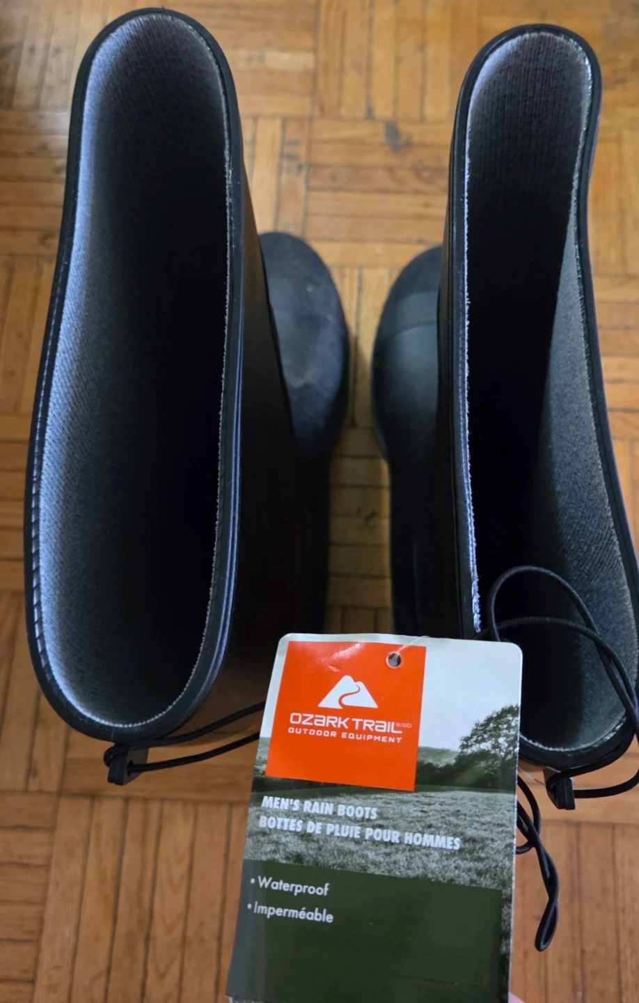 Brand new Ozark Trail men's waterproof rain boots. Black colour, size 11. These boots are made for outdoor equipment use.