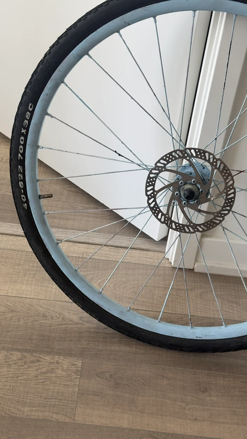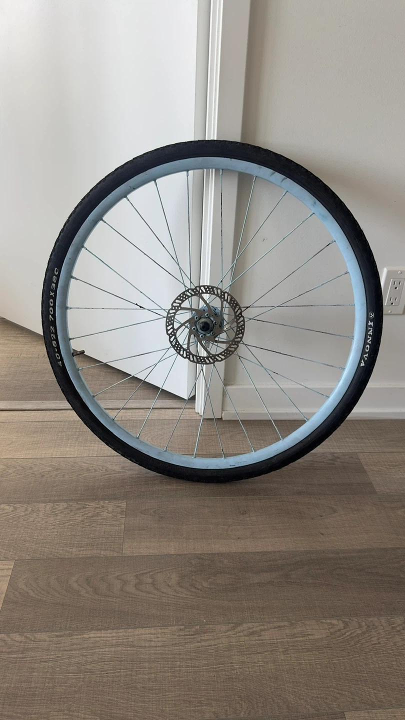 This is a 700c bicycle wheel with a tire. It's equipped with a disc brake rotor and has a light blue rim. The tire size is 700x38c.