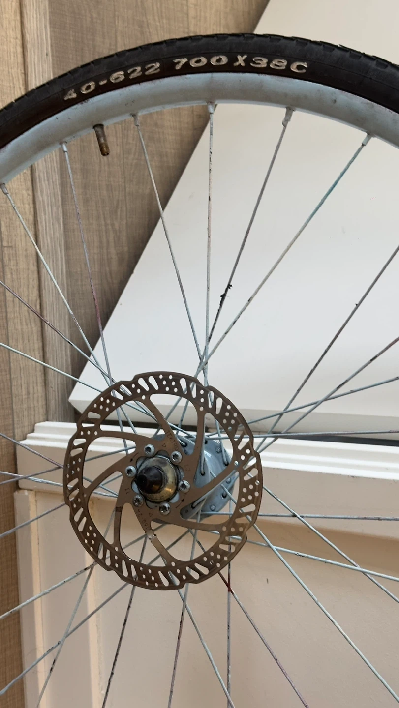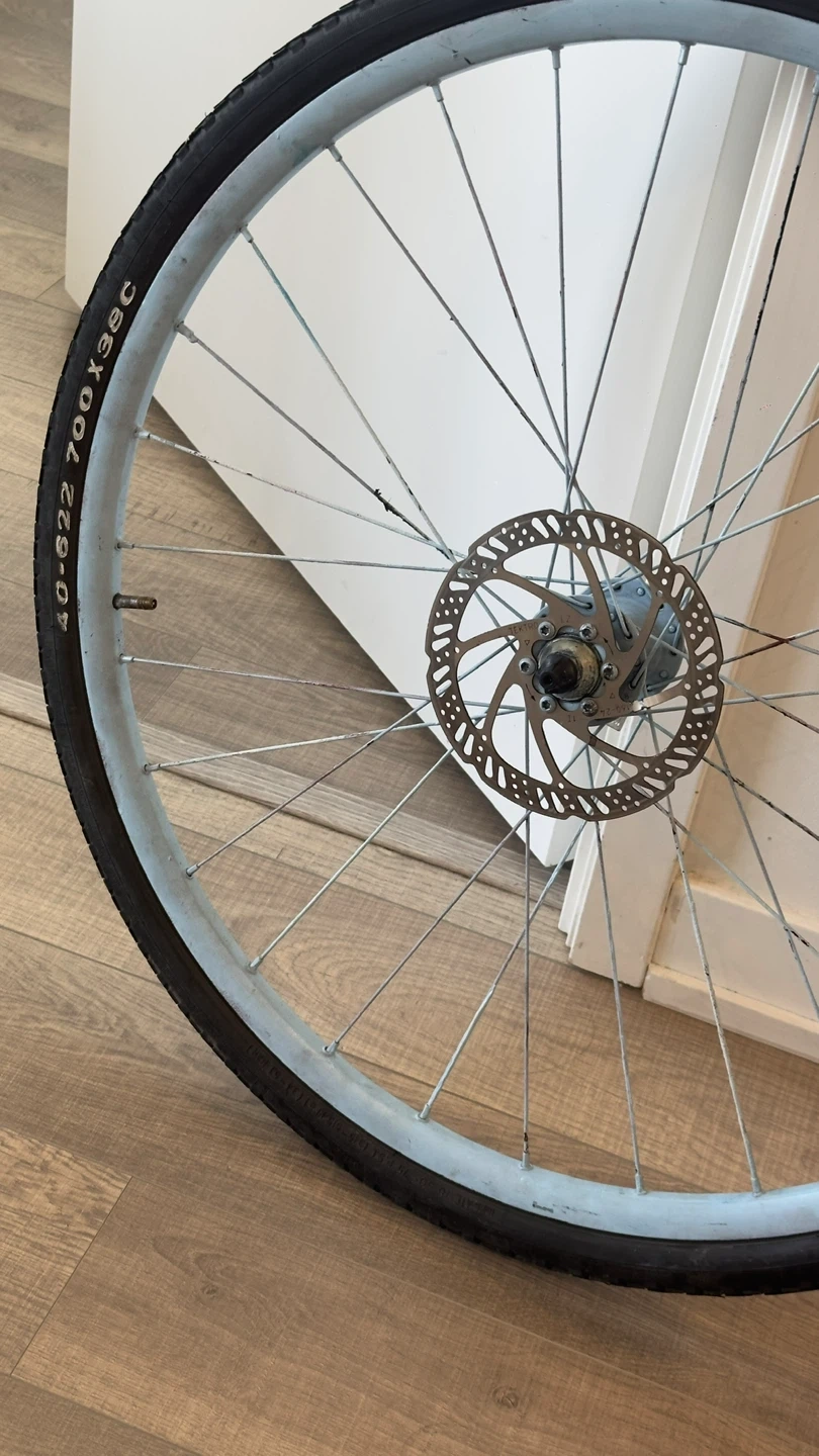 This is a 700c bicycle wheel with a tire. It's equipped with a disc brake rotor and has a light blue rim. The tire size is 700x38c.