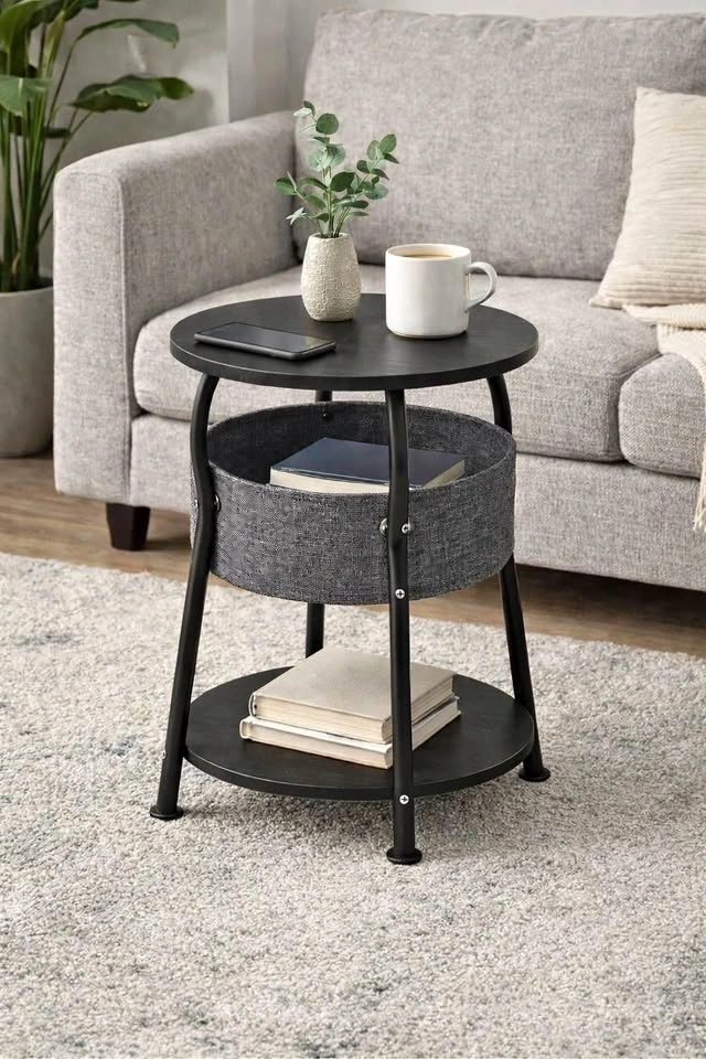 New Black 3-Tier Round End Table with Storage Basket