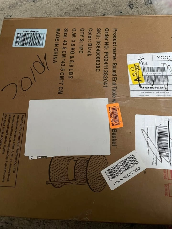 New 3-tier round end table with a handy storage basket. Black finish. Dimensions: 15.75 inches wide, 15.75 inches deep, and 21.7 inches high. Still in box, unassembled. I only opened the box to take pictures and see what it looked like. Never used, has all pieces - take as is unassembled. Sales are final.