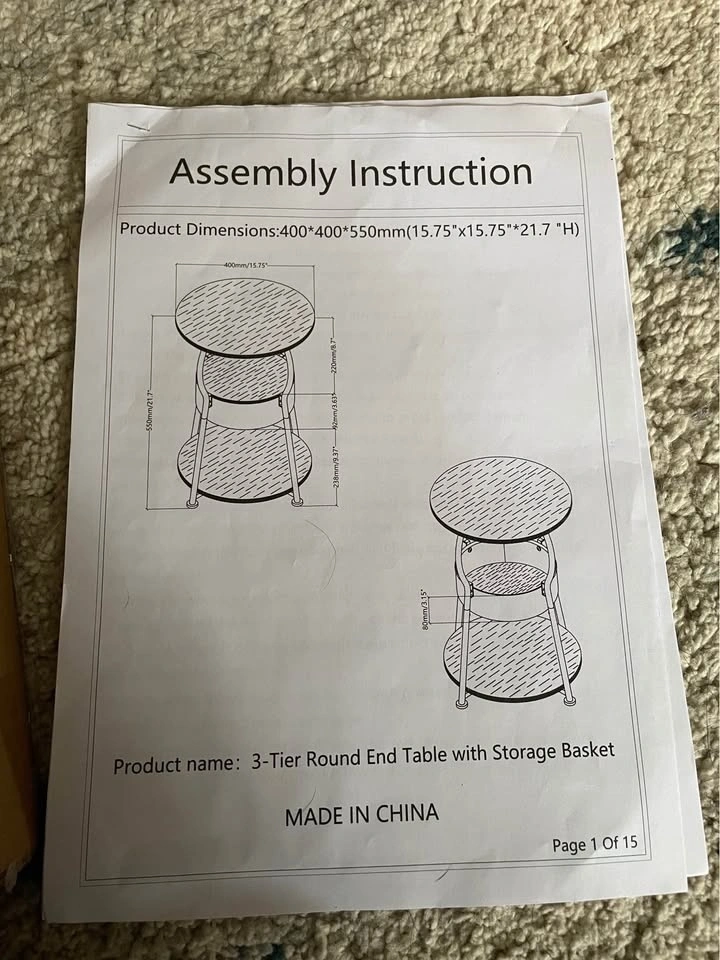 New 3-tier round end table with a handy storage basket. Black finish. Dimensions: 15.75 inches wide, 15.75 inches deep, and 21.7 inches high. Still in box, unassembled. I only opened the box to take pictures and see what it looked like. Never used, has all pieces - take as is unassembled. Sales are final.