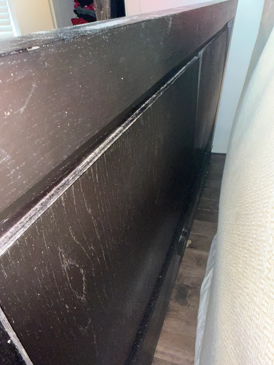 Queen size bed frame in a dark wood finish. It features two large storage drawers built into the base. Slats are included for mattress support.