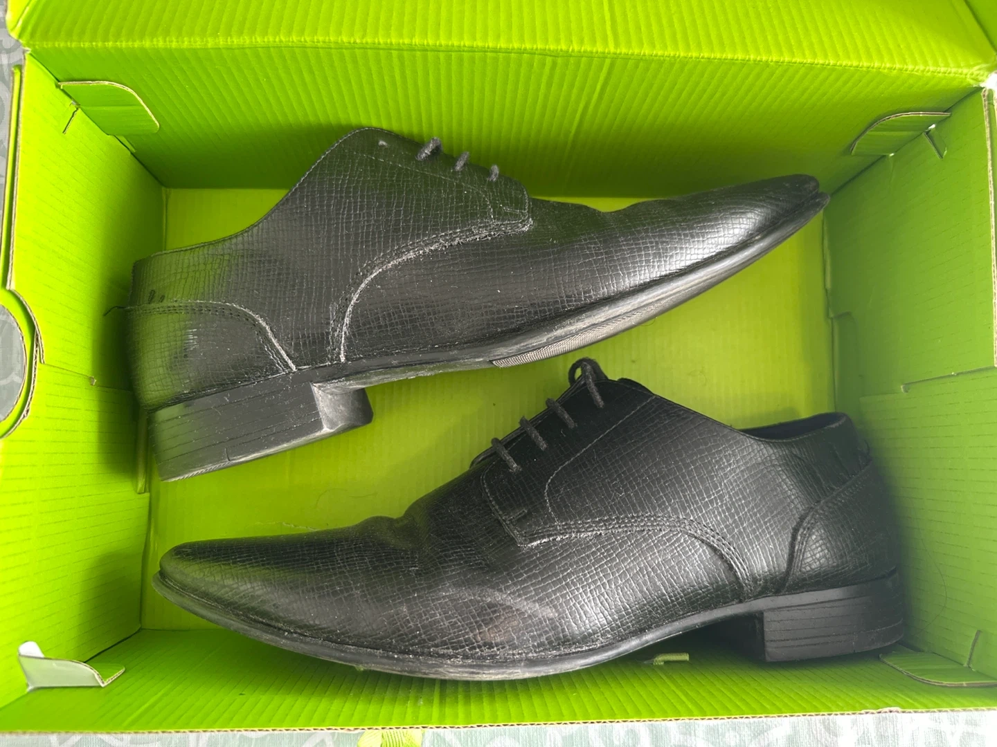 These are a pair of black dress shoes. They have a textured faux leather upper and a classic lace-up design. The sole appears to be synthetic. Great for formal occasions!