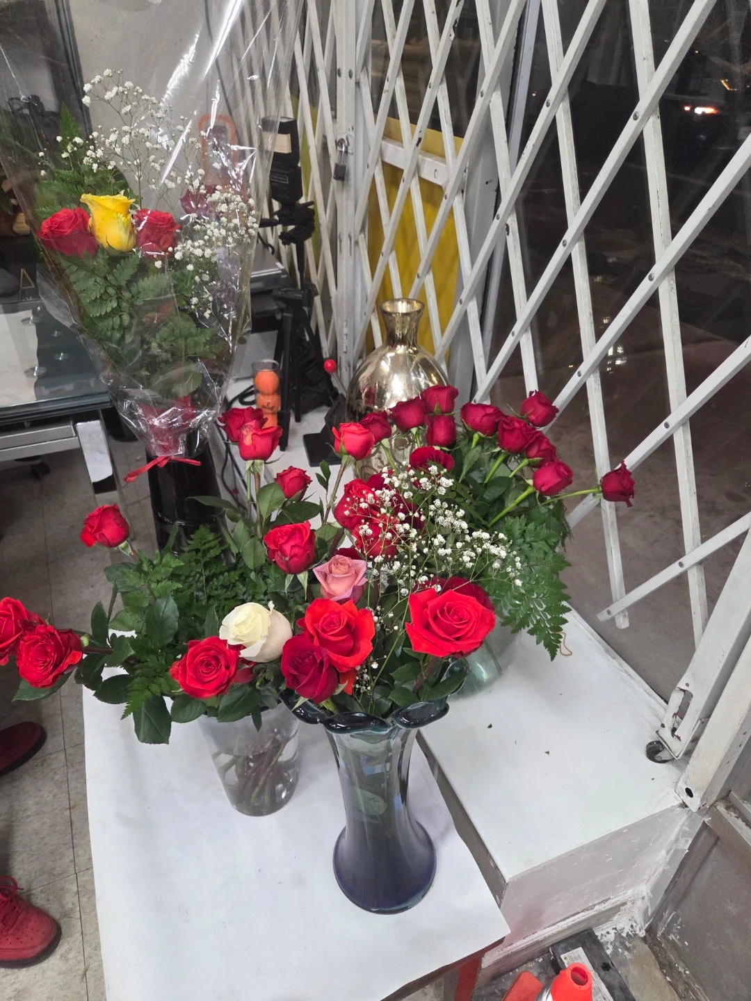 A vibrant bouquet featuring a mix of red, white, and yellow roses, accented with baby's breath and greenery. Presented in clear cellophane with a festive red ribbon. This arrangement is perfect for brightening any space or as a thoughtful gift.