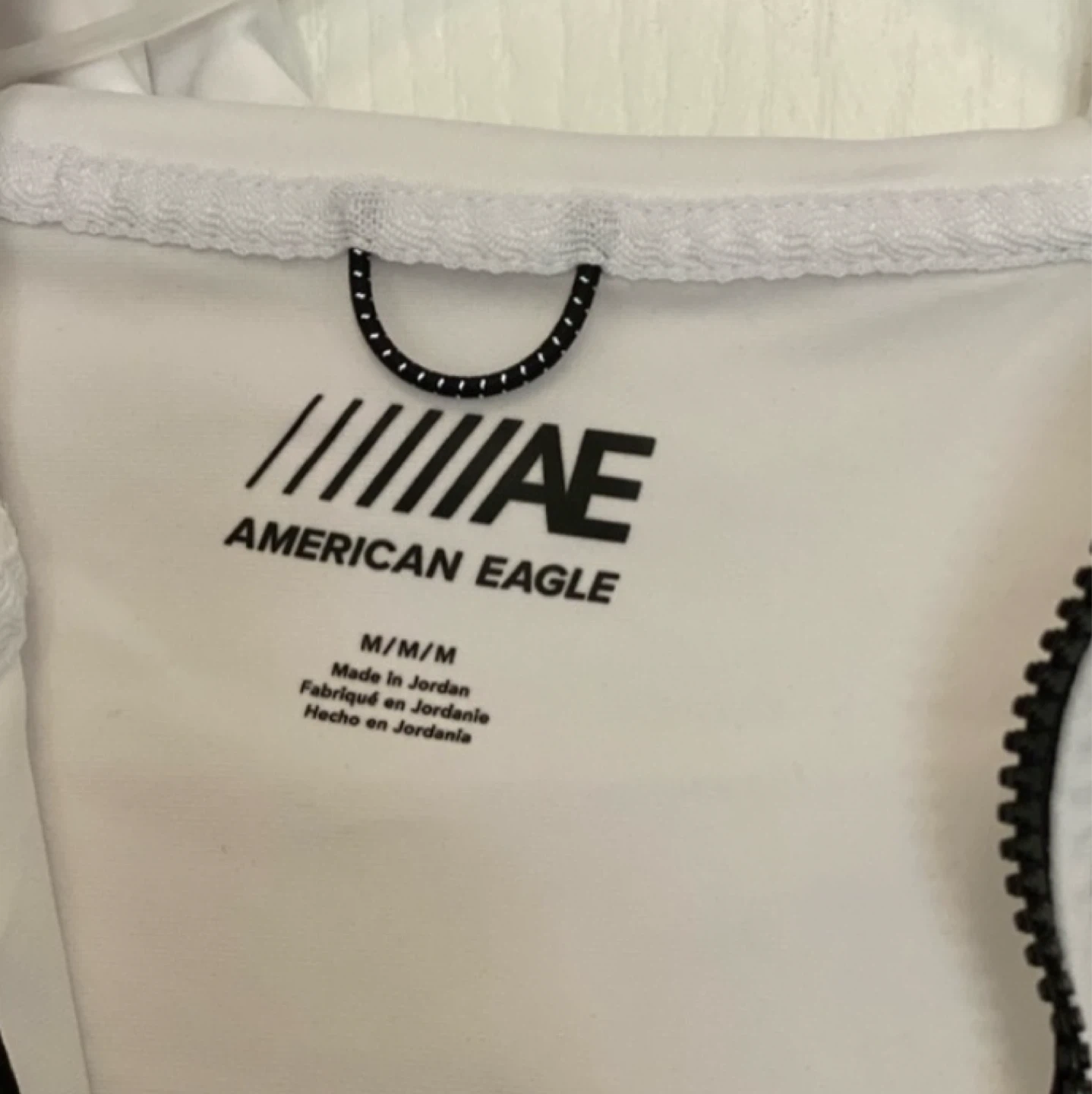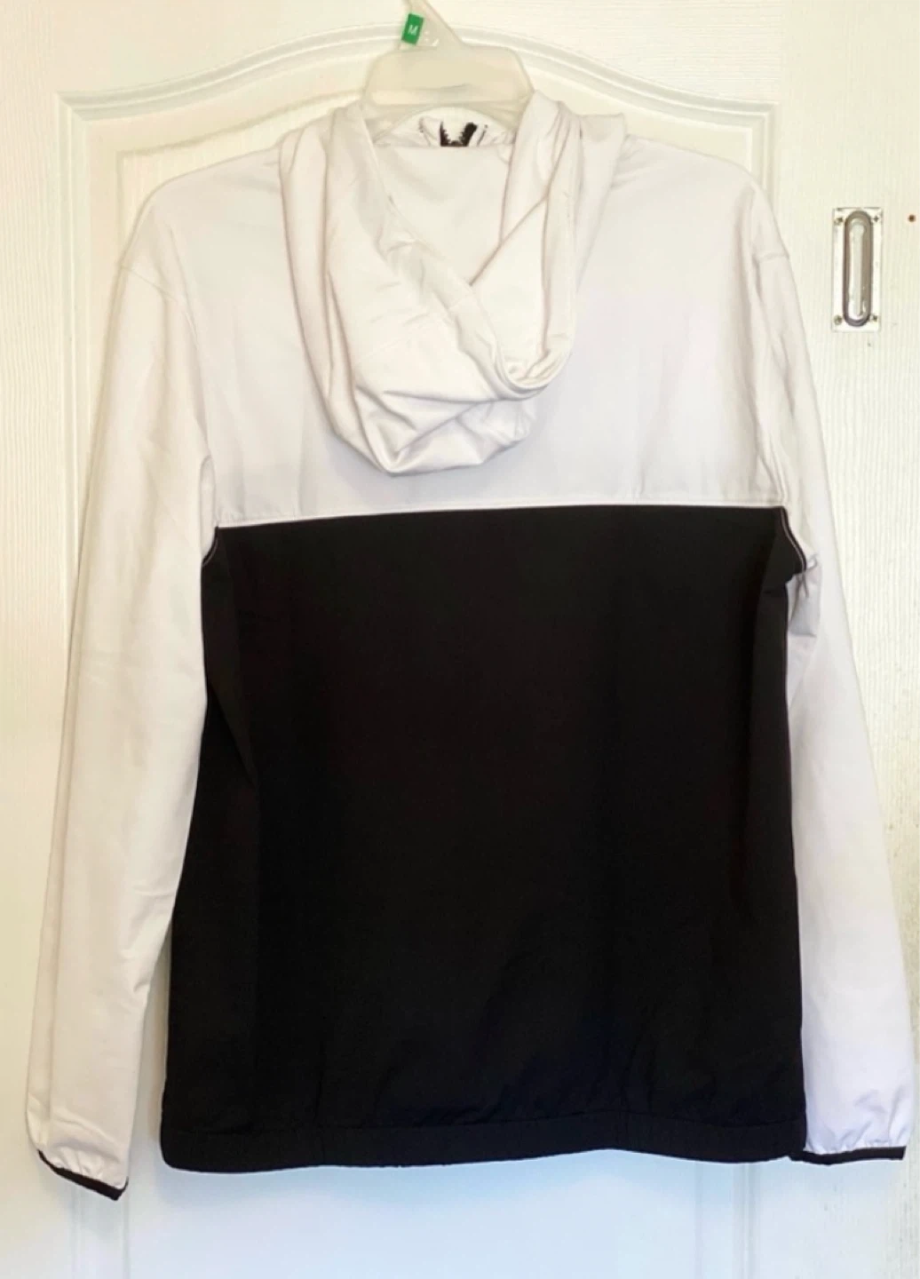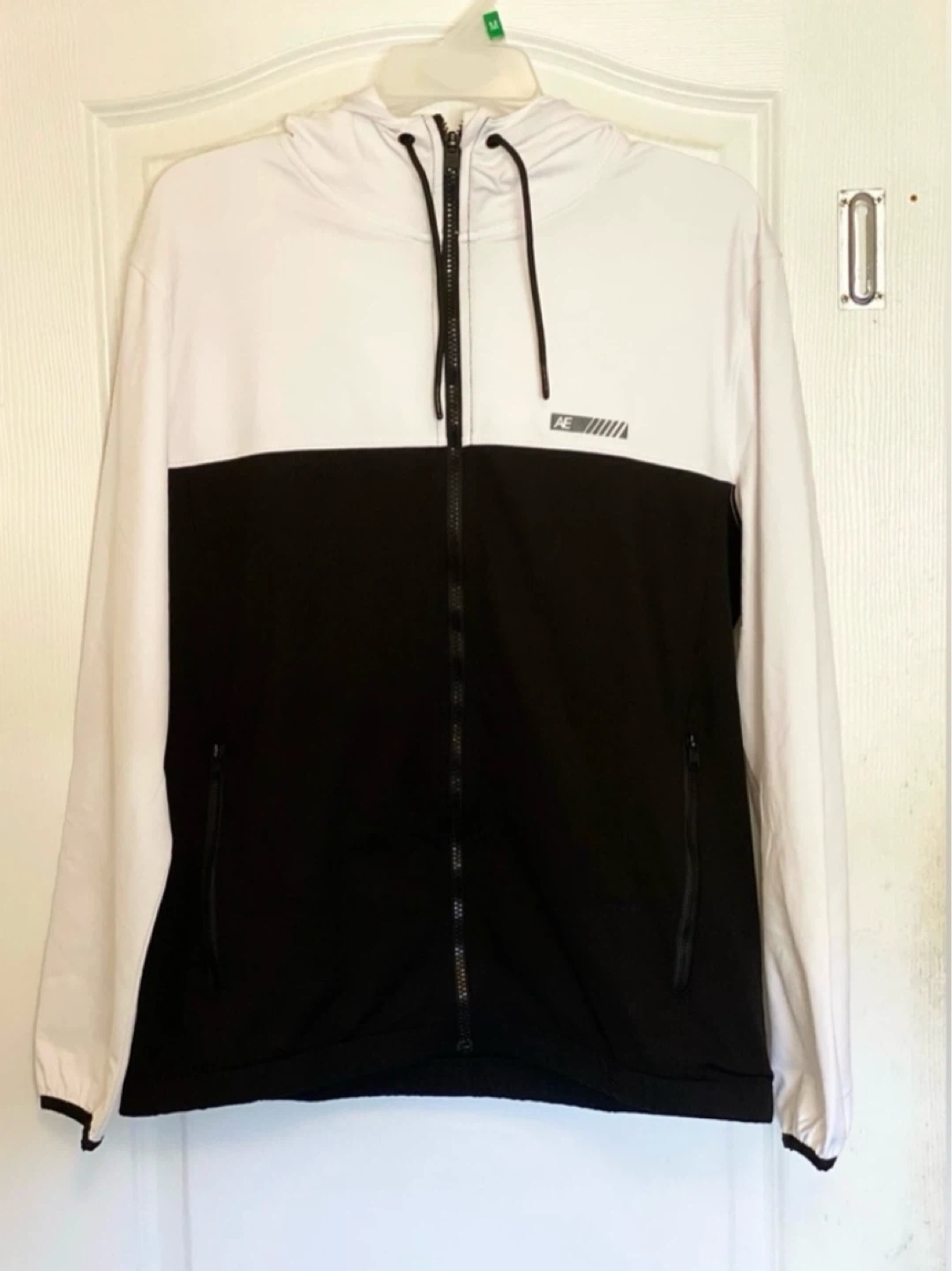 American Eagle Outfitters jacket in a cool black and white colour block design! It's made of 100% polyester and is a size medium. Machine wash cold separately in garment bag, tumble dry low, warm iron if needed