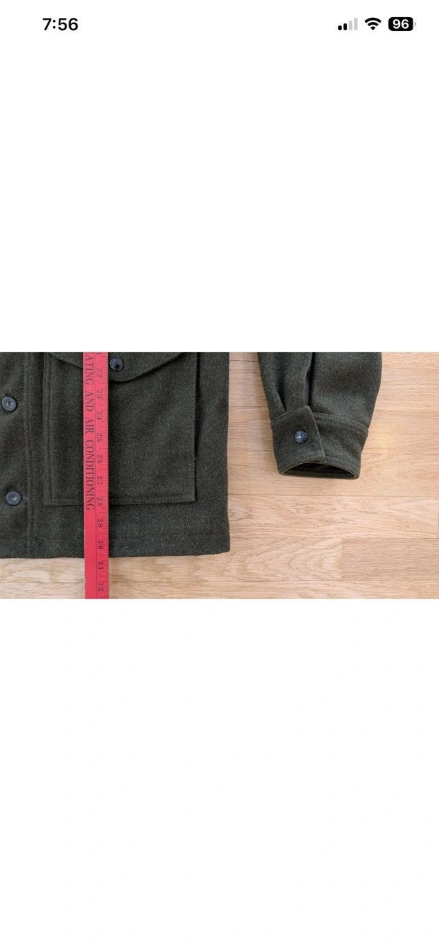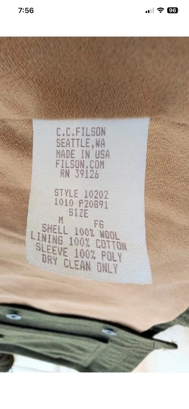 RARE Filson Greenwood Green Wool Cruiser Jacket, size medium. This item is in basically NEW Condition. It's also been discontinued, so this is a rare find. A heavy, rugged Yukon wool jacket with soft cotton moleskin lining and a plethora of pockets. The virgin Yukon wool in this jacket will absorb as much as 30% of its own weight in moisture without becoming damp or clammy. As a result, the jacket will handle light rainfall and retain your body warmth even when wet. For added comfort and warmth, the Greenwood features cotton Moleskin and polyester linings while its standing collar helps block cold and wind. Filson gave the Greenwood a Seattle fit which means the Greenwood has a tailored fit allows room for mobility through the shoulders and enables the jacket to sit comfortably close to your body. It's a versatile look that's built for the outdoors but cut for the city. Four front flap pockets with snap closures, a lower left compass pocket, an internal zippered pocket, and an internal patch pocket. Three utility slots on upper left pocket 100% virgin Yukon wool Cotton Moleskin body lining Polyester taffeta sleeve lining Seattle fit Double snap closure Standing collar lined with cotton Moleskin Four front flap pockets with snap closure Three utility slots on upper left pocket Lower left compass pocket, internal zippered pocket, and internal right patch pocket Dry clean only Made USA