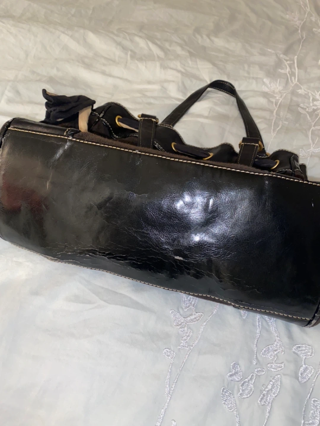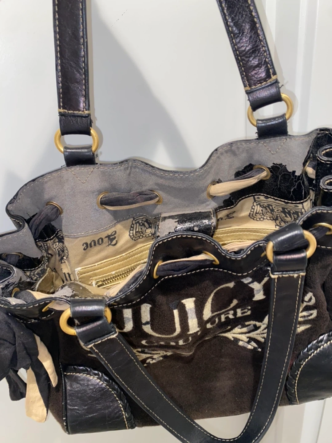 Please note that there are flaws such as peeling on the interior pockets + inside leather trim which unfortunately happens with age for the vintage Juicy Couture bags 🥹🙏🏼