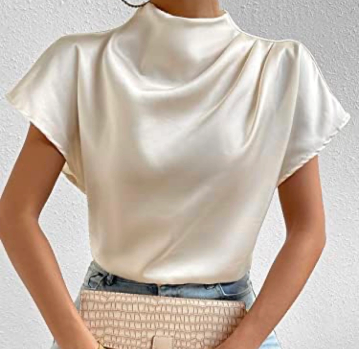 Elegant cream-coloured satin blouse. Mock neck design. Short sleeves. Relaxed fit. Made in China.