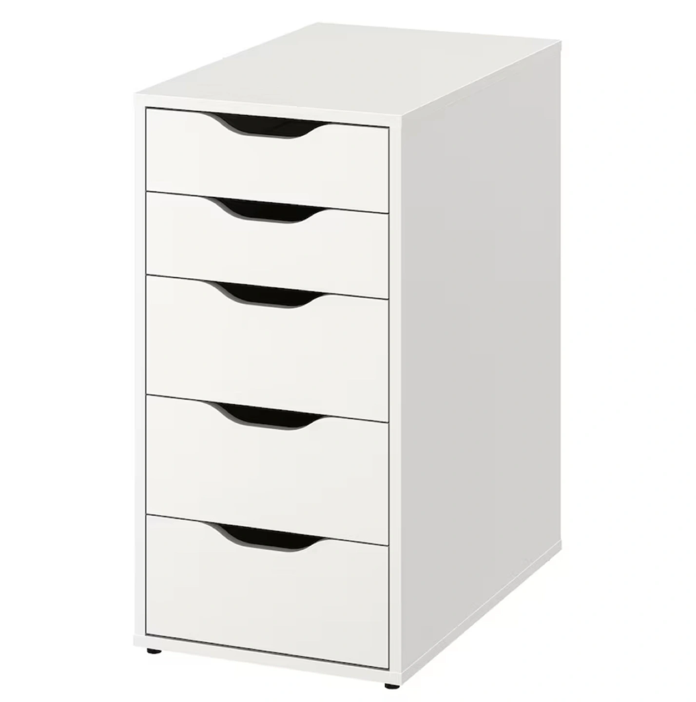 White storage organizer with five drawers. Great for organizing small items in a bedroom, office, or bathroom.