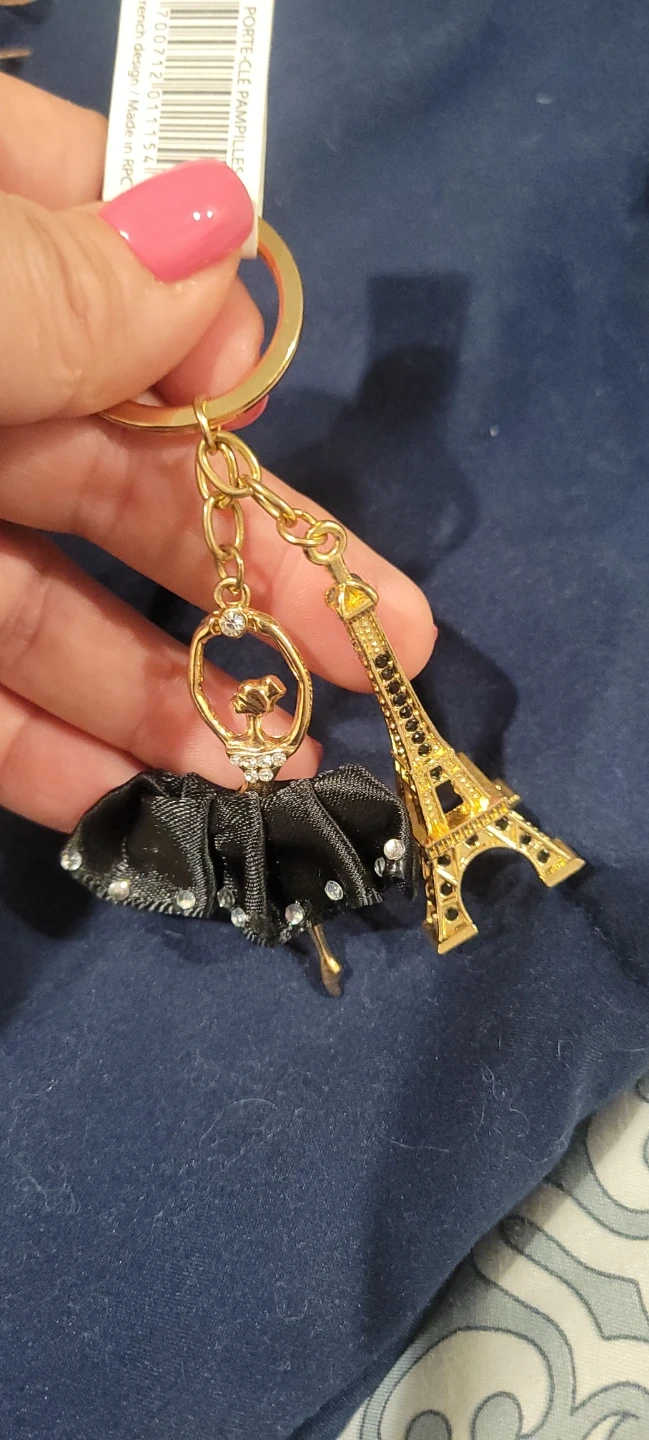 Gold-tone keychain with an Eiffel Tower charm and a black ballerina charm. The ballerina charm has a fabric skirt adorned with rhinestones. It's a fun accessory for any bag or set of keys!