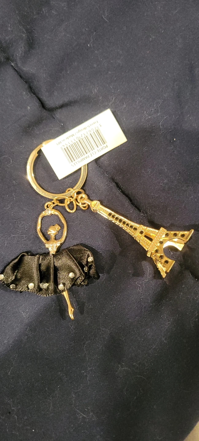 Gold-tone keychain with an Eiffel Tower charm and a black ballerina charm. The ballerina charm has a fabric skirt adorned with rhinestones. It's a fun accessory for any bag or set of keys!