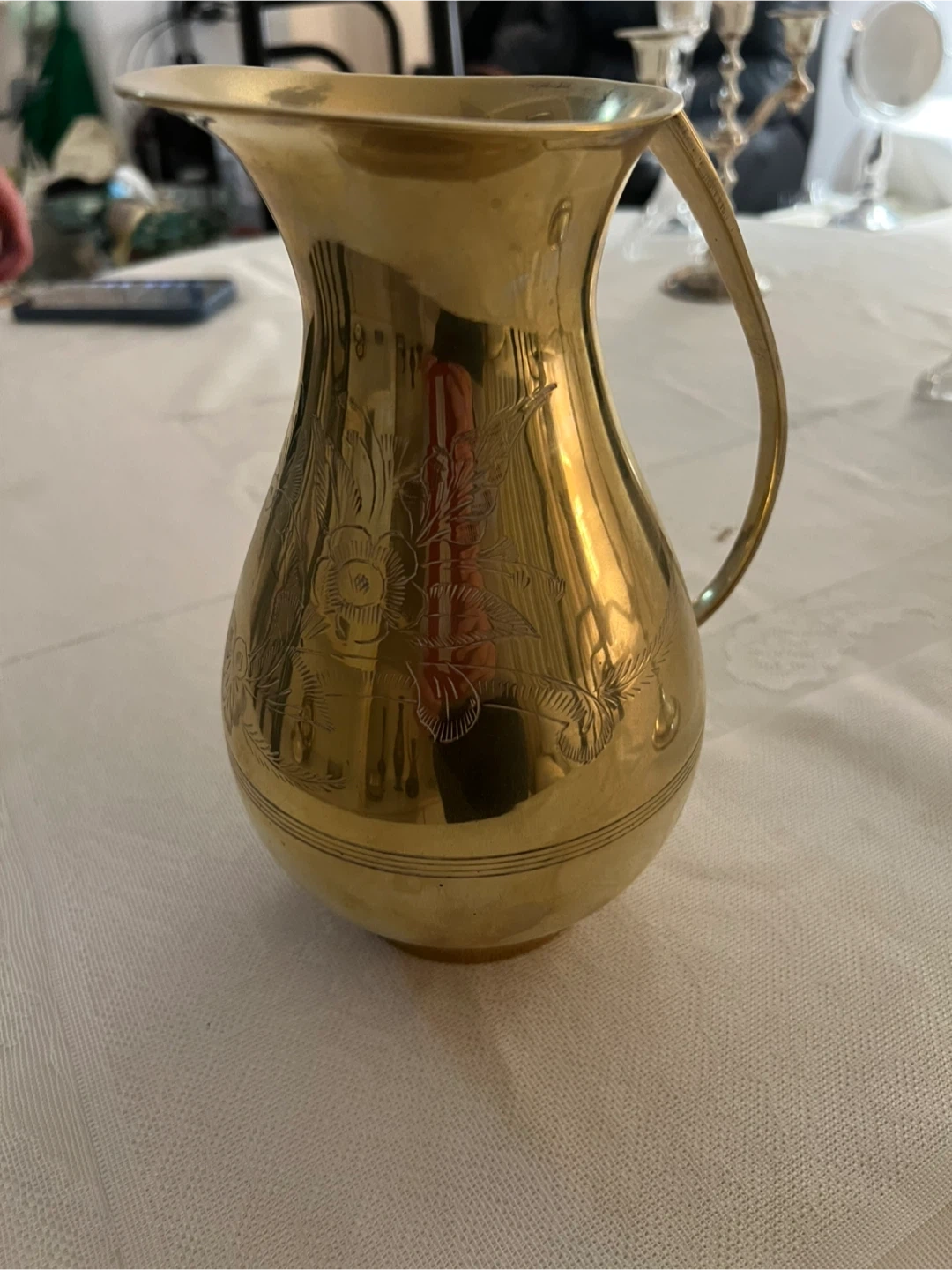 Selling a lovely vintage brass pitcher! It has a beautiful floral design etched into the metal. Perfect for adding a touch of elegance to your home decor