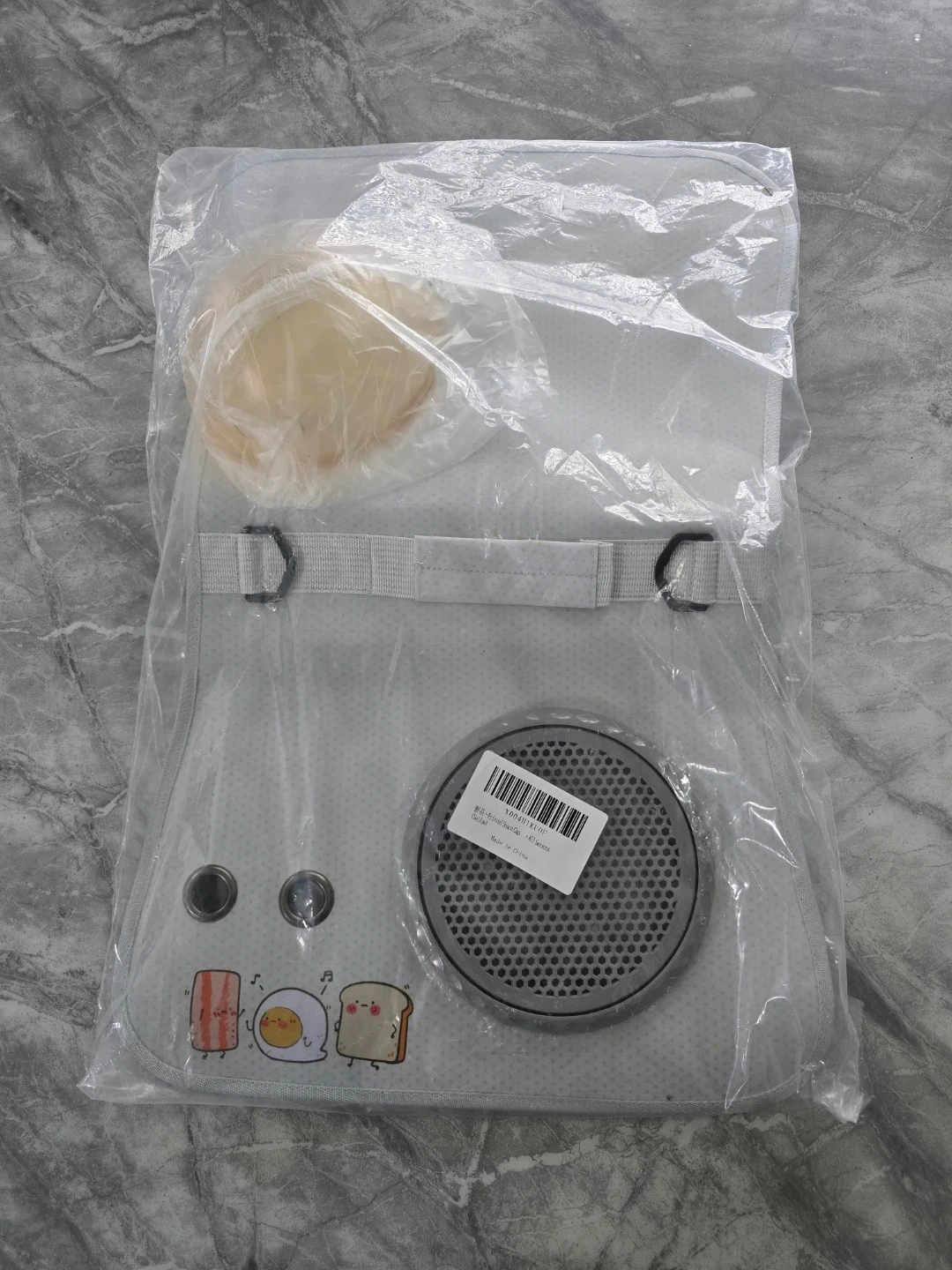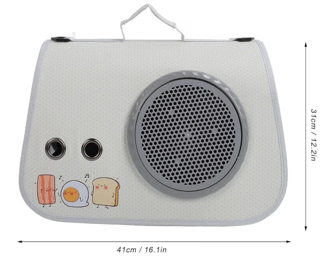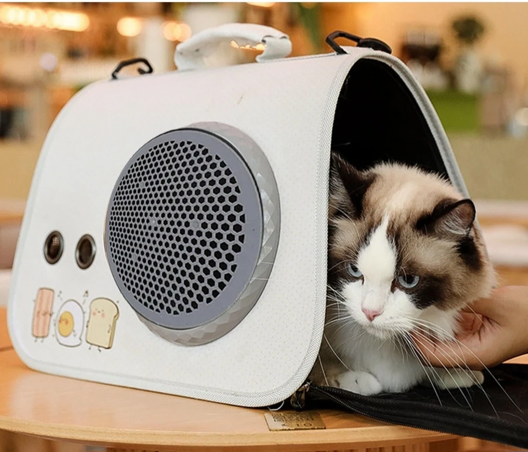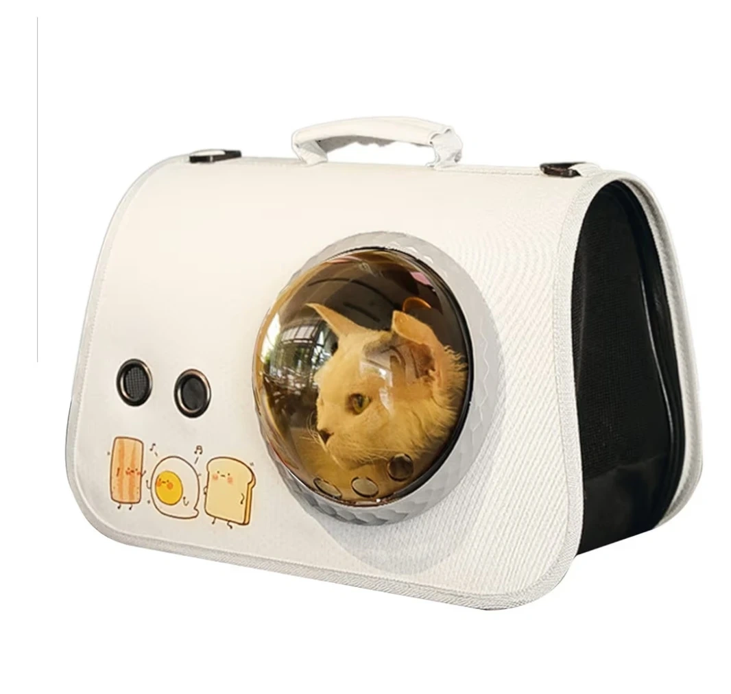 Cute cat carrier bag with a bubble window for your pet to see out. It has a large space design and's suitable for cats up to 16.5lb. Features a ventilation fan and cute toast and egg graphics!