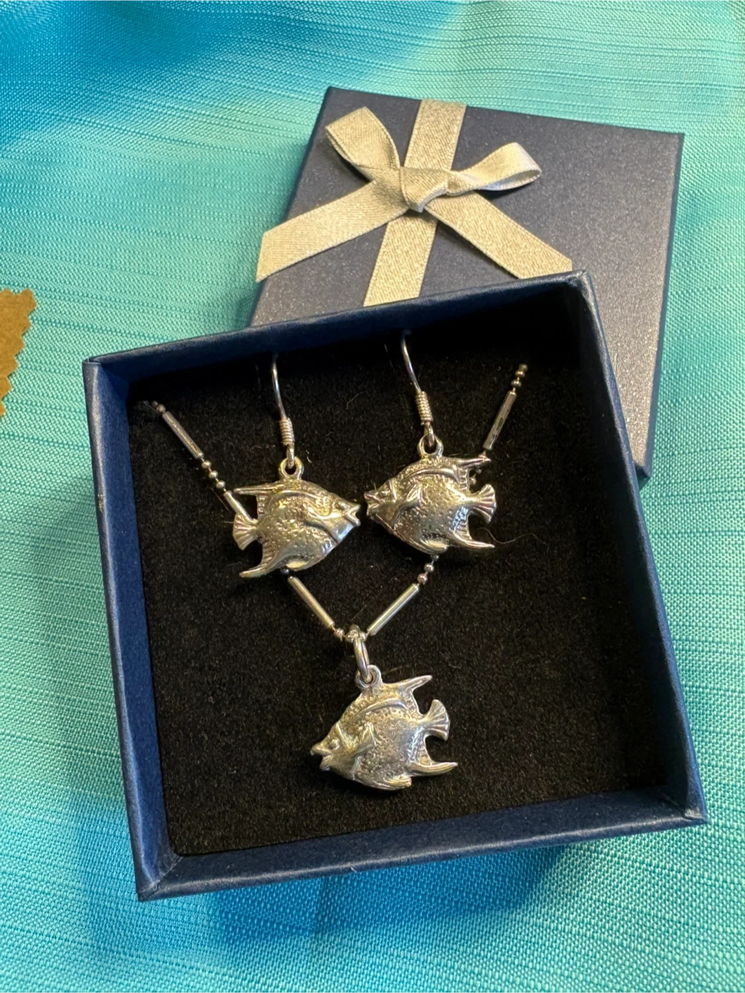A fish sterling silver pendant necklace and matching dangle earrings. This set comes in a blue gift box. Purchased in Belize. Chain is 20 inches long. Fish are solid, cute and nicely detailed.