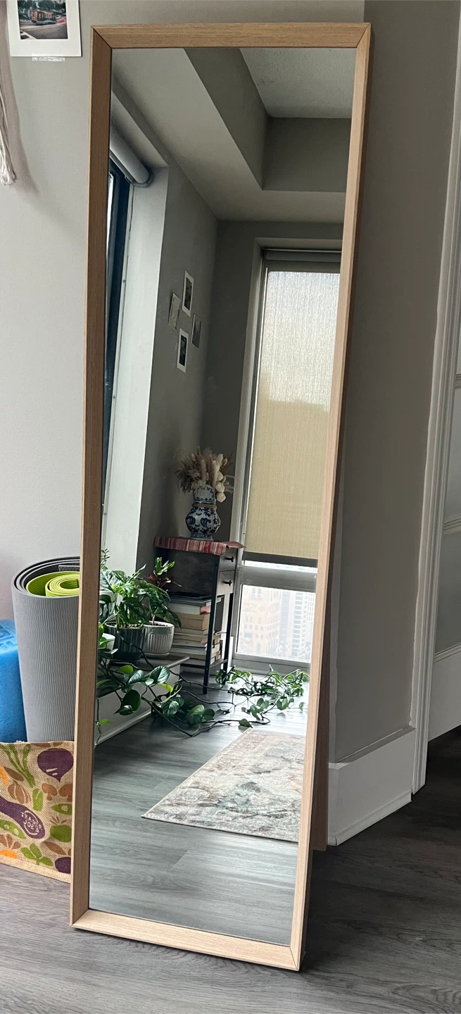 Selling a full-length mirror with a light wood frame. It's in great condition and ready to brighten up your space! Perfect for bedrooms, living rooms, or entryways.